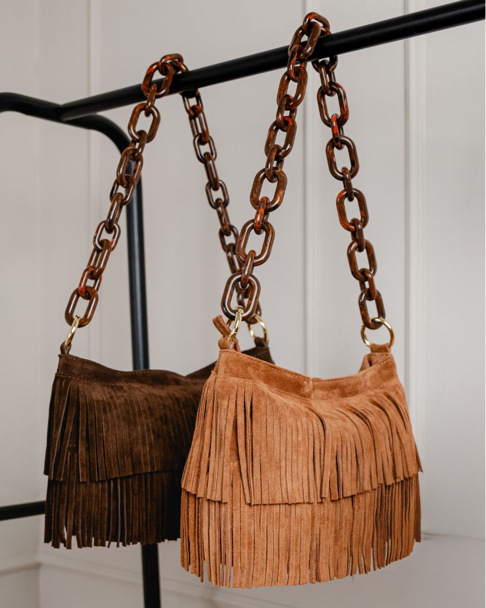 Negli anni Settanta il camoscio ha segnato la moda con giacche con frange, stivali e borse boho-chic, diventando simbolo di libertà stilistica. Oggi ritorna con interpretazioni più moderne e trasversali, che ne valorizzano morbidezza e allure senza tempo.