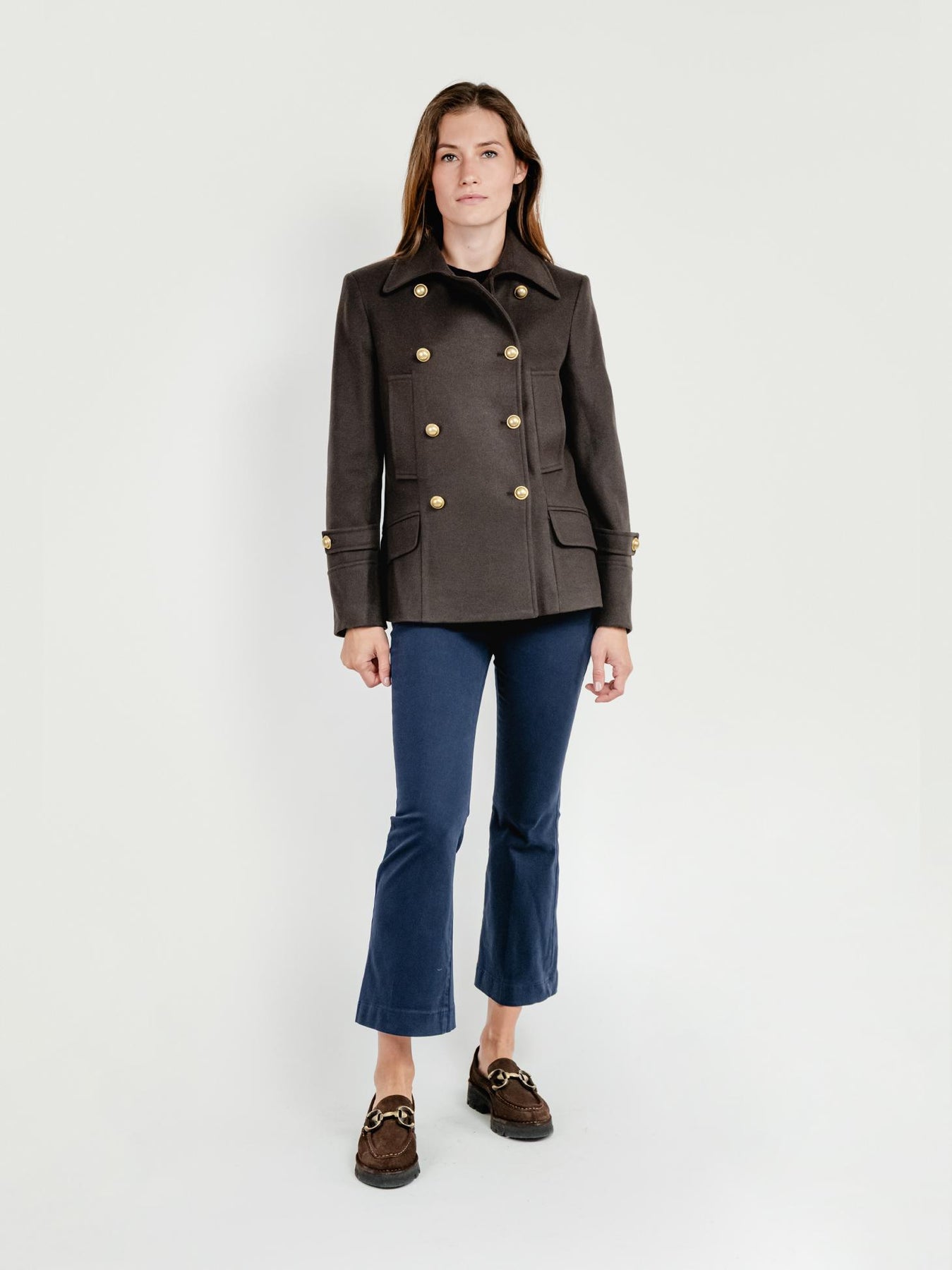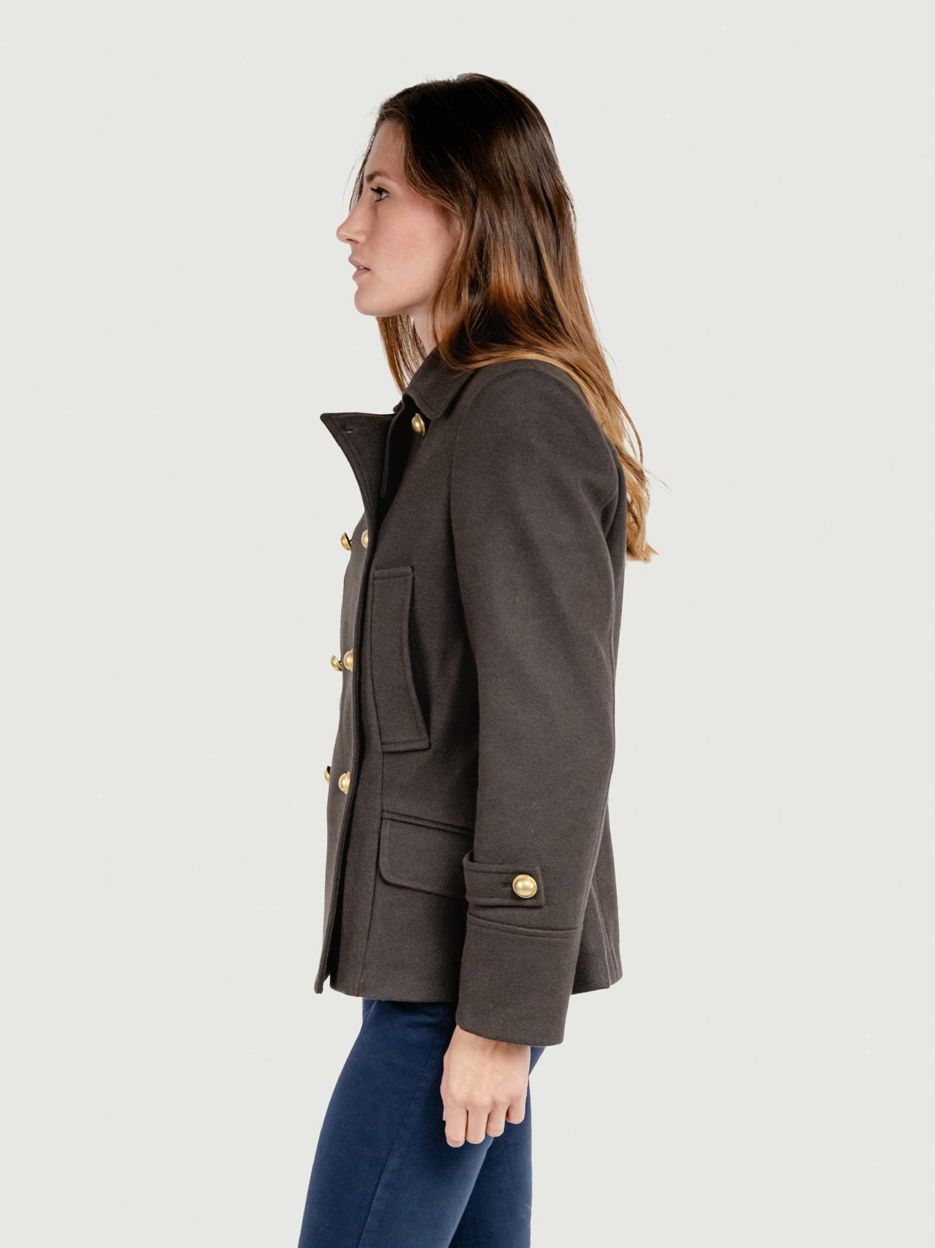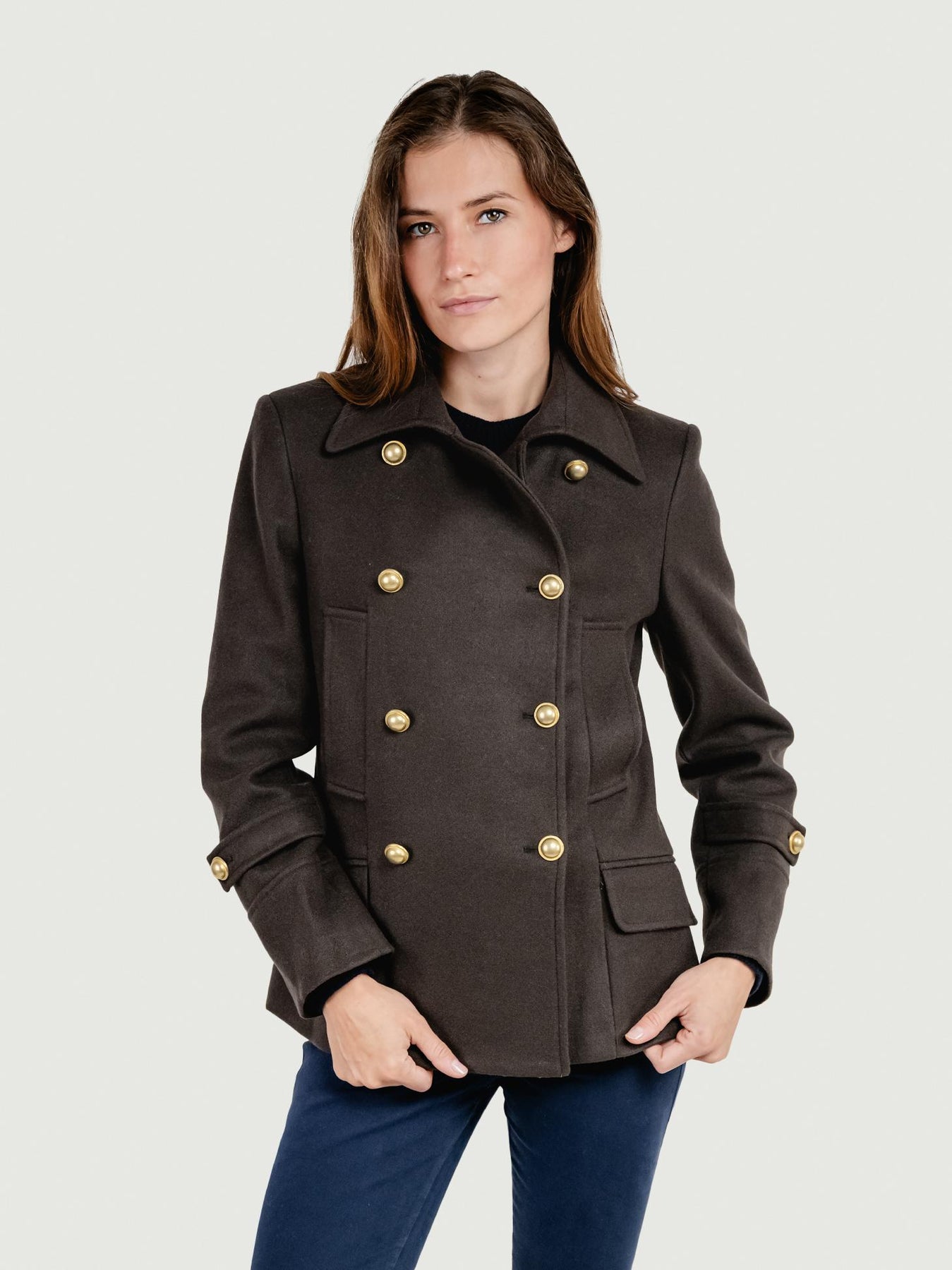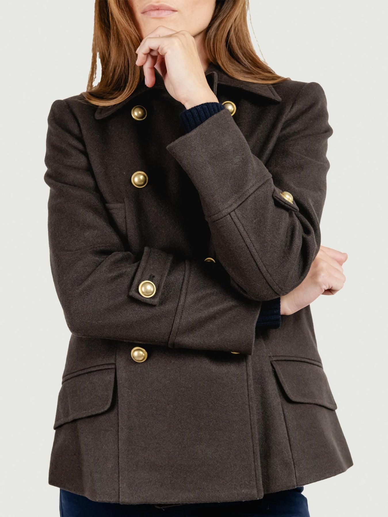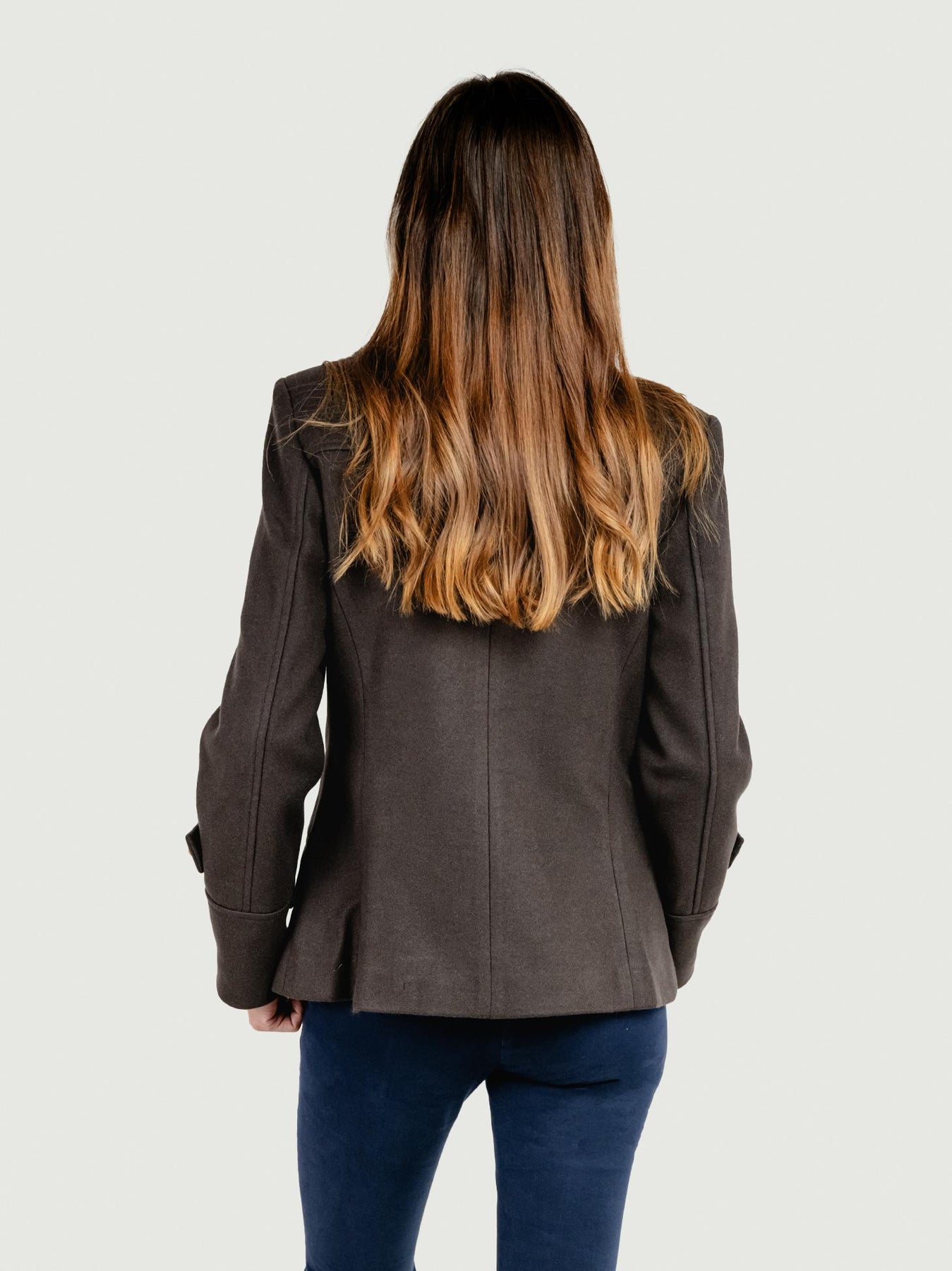 Giacca doppiopetto con bottoni in metallo effetto ottone.