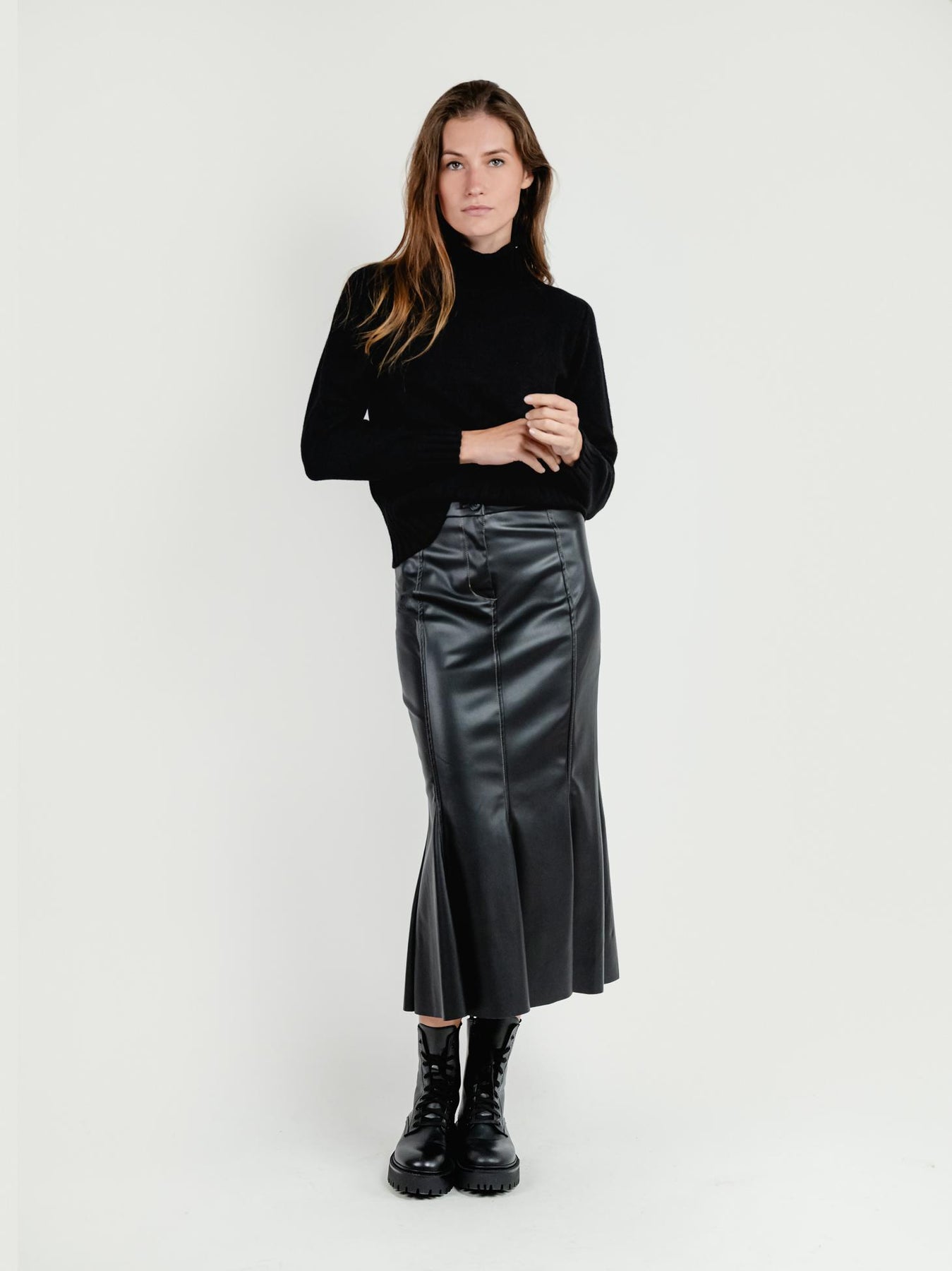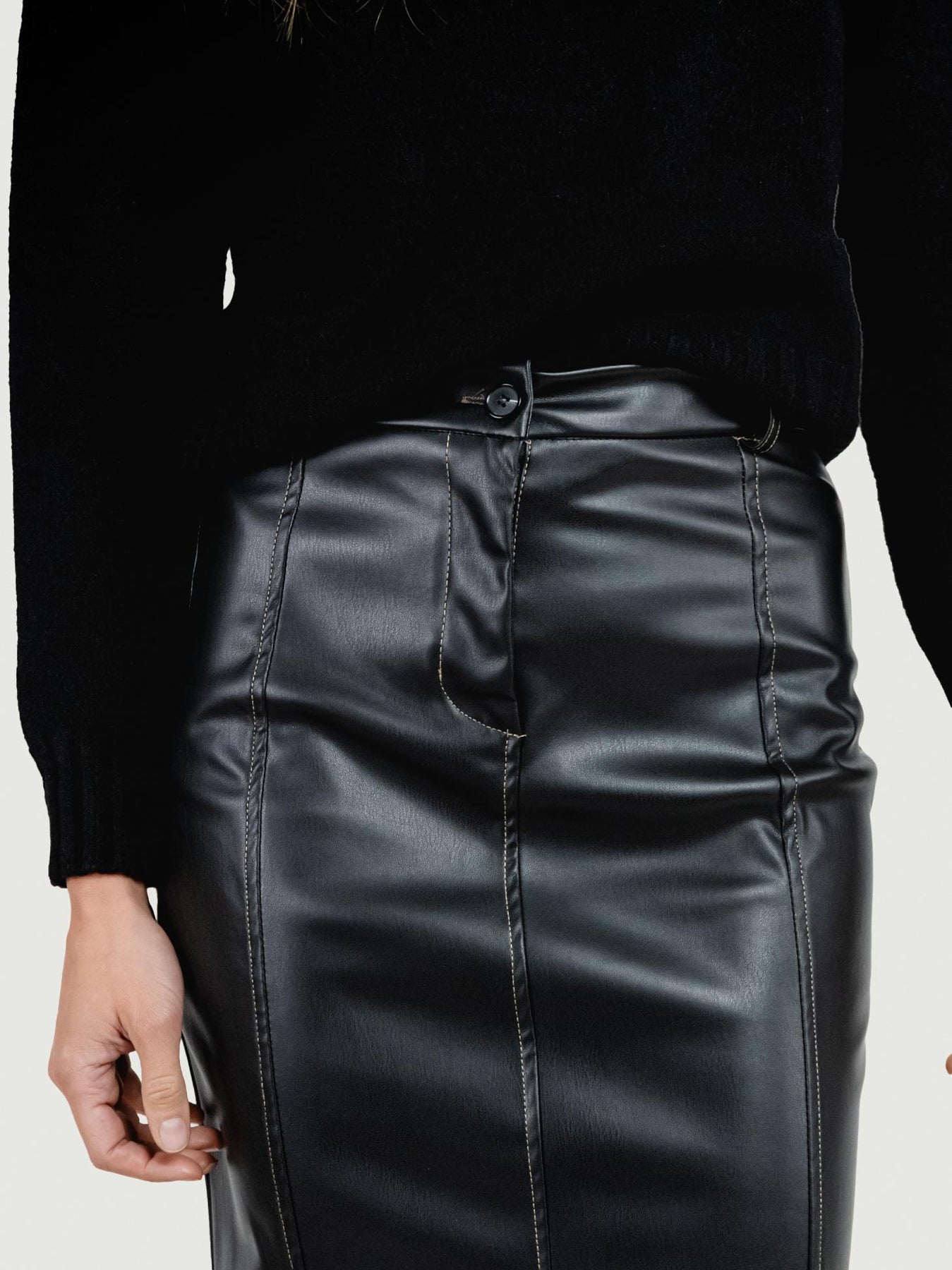 Longuette in ecopelle con balze sul fondo. Dettaglio cuciture contrasto. Chiusura a bottone con zip a scomparsa. La modella è alta 178 cm e indossa la taglia XS. Composizione: 50% PL, 50% poliuretanica. Made in Italy. Designer: Andrea Morando.