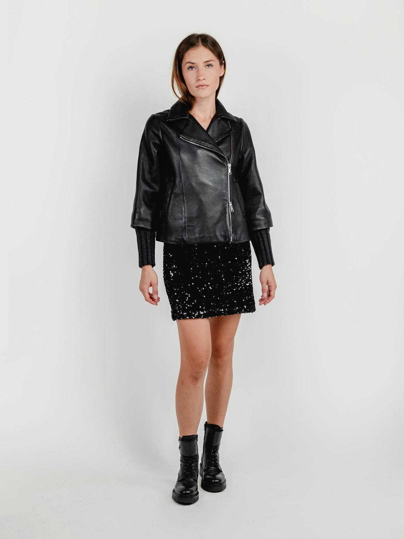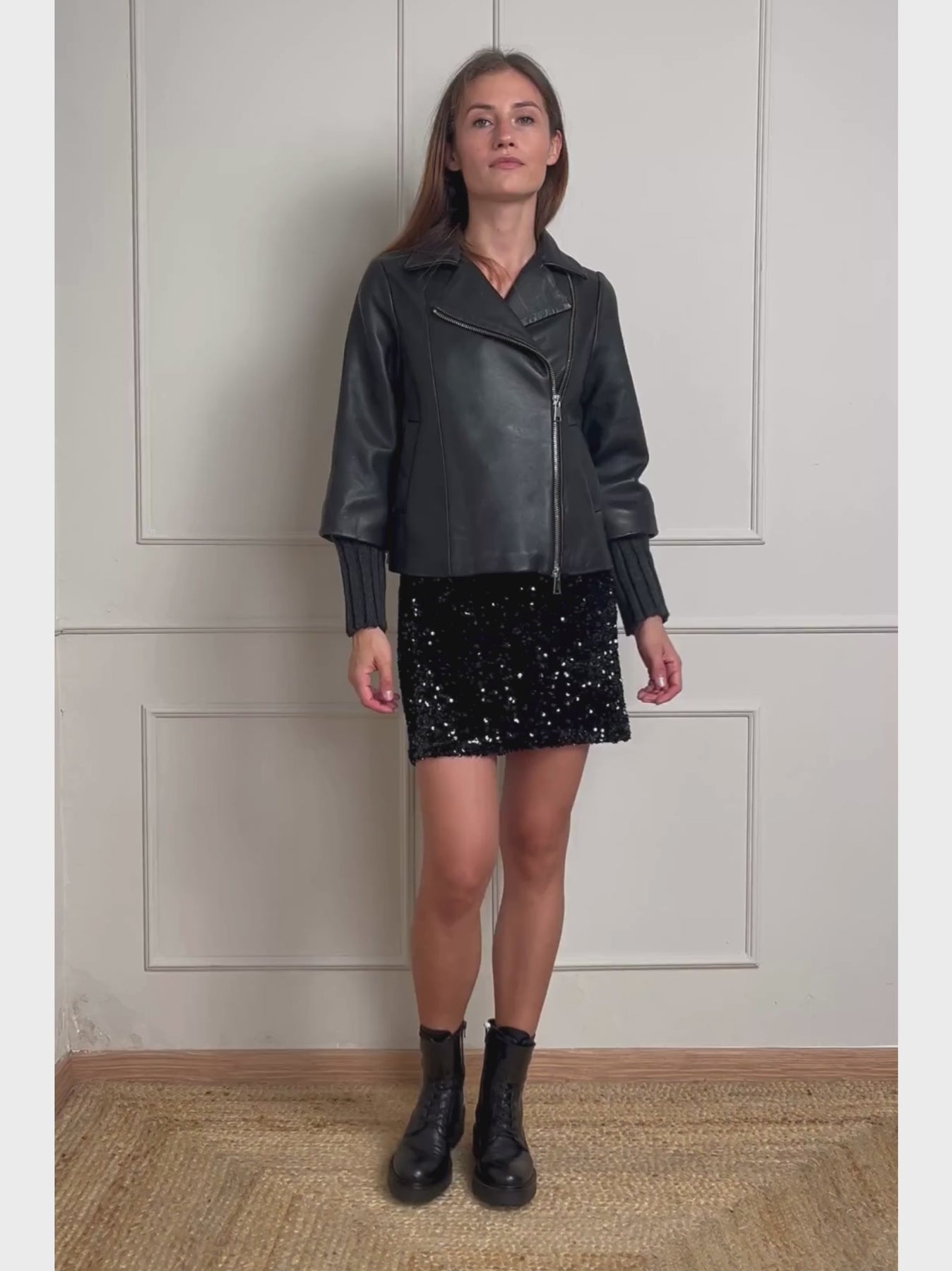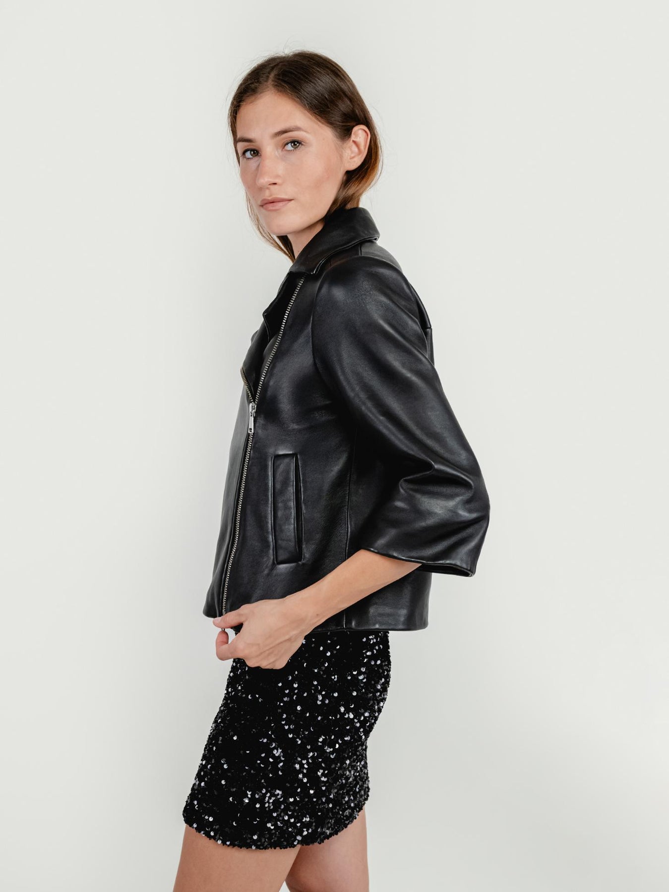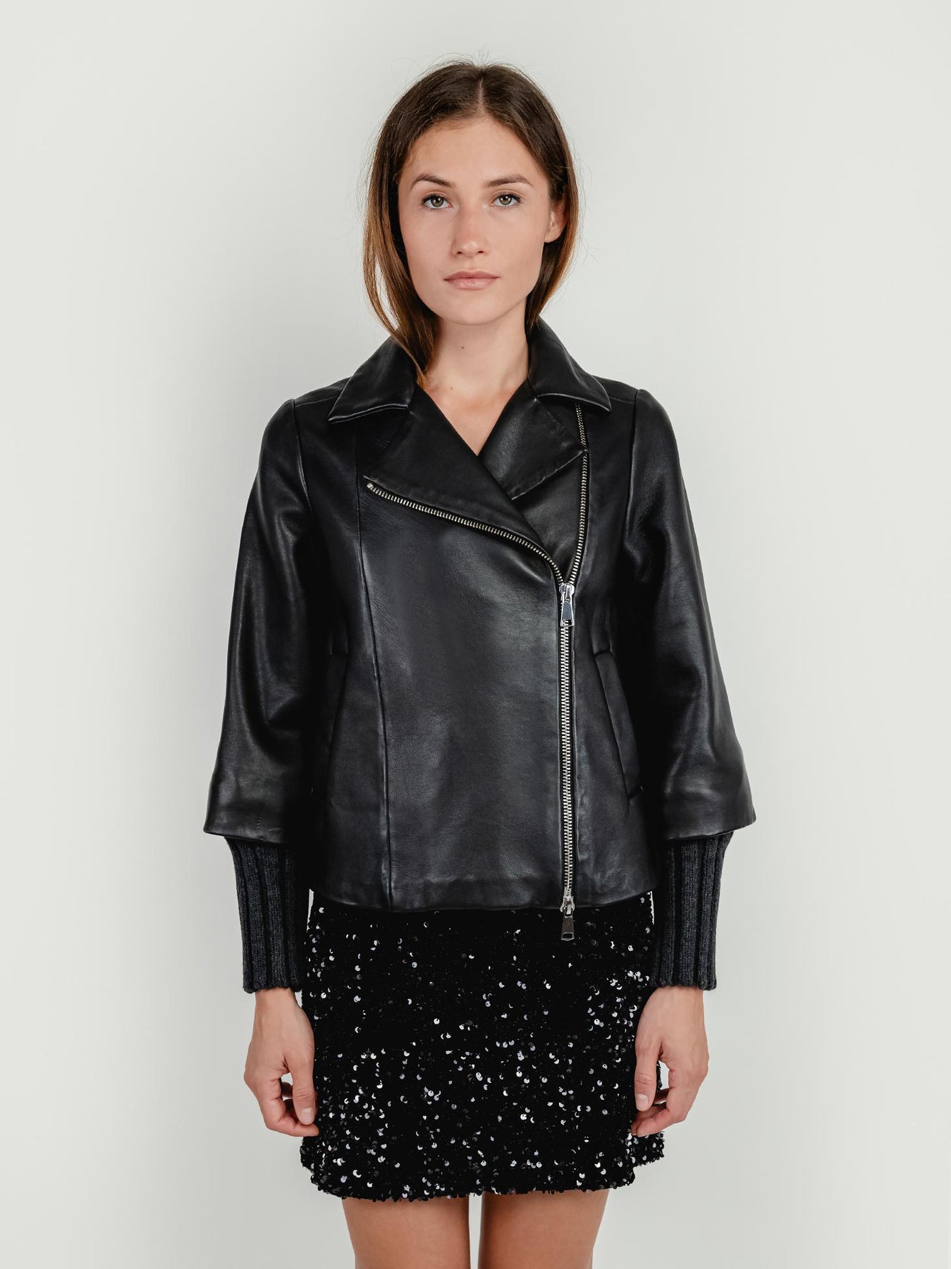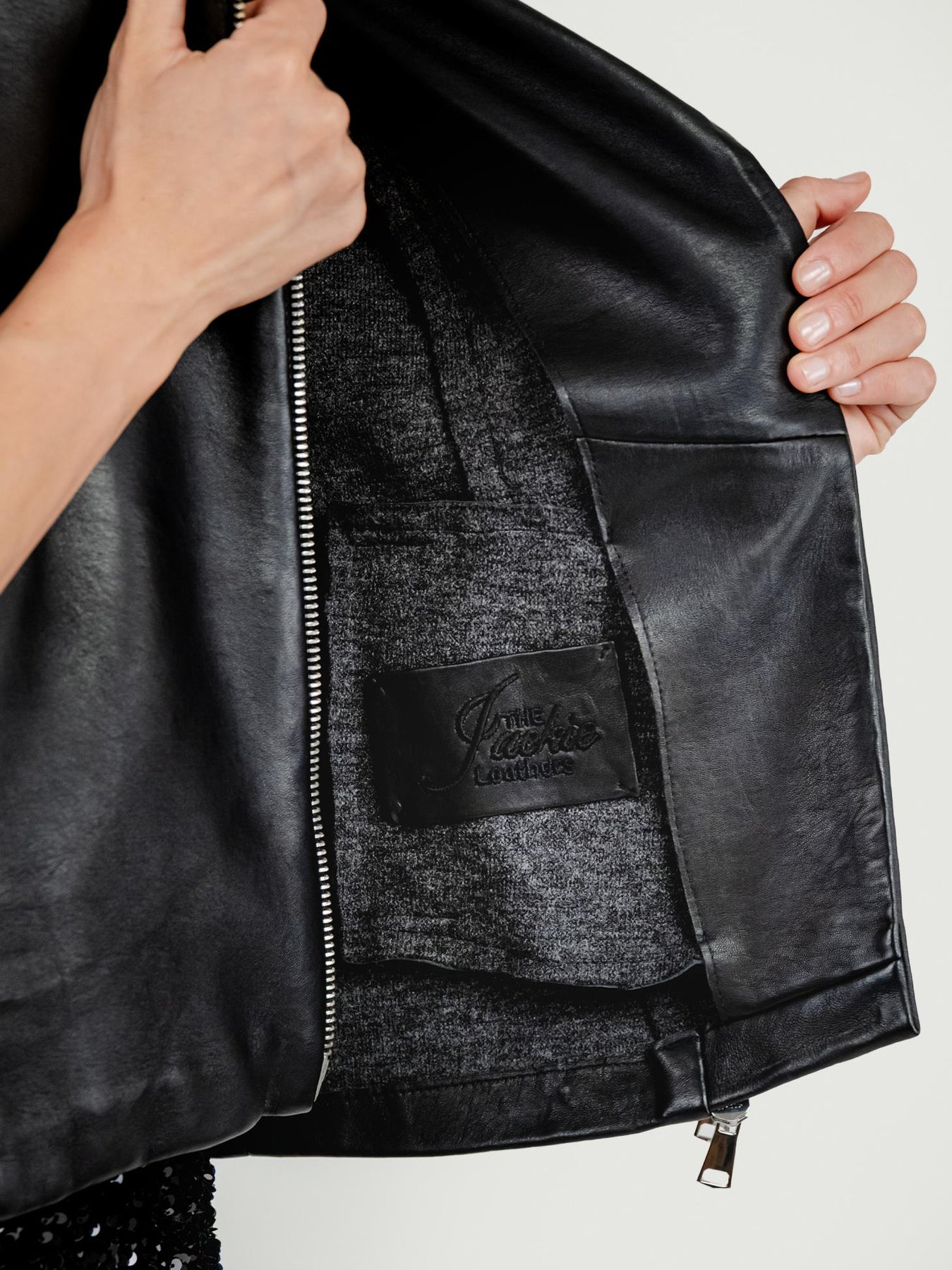 Giacca Gemini in nappa nera con chiusura a zip laterale a doppio cursore.