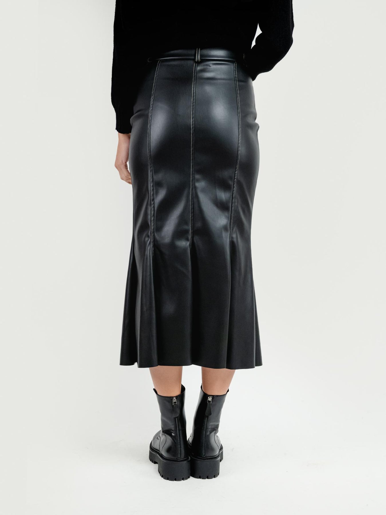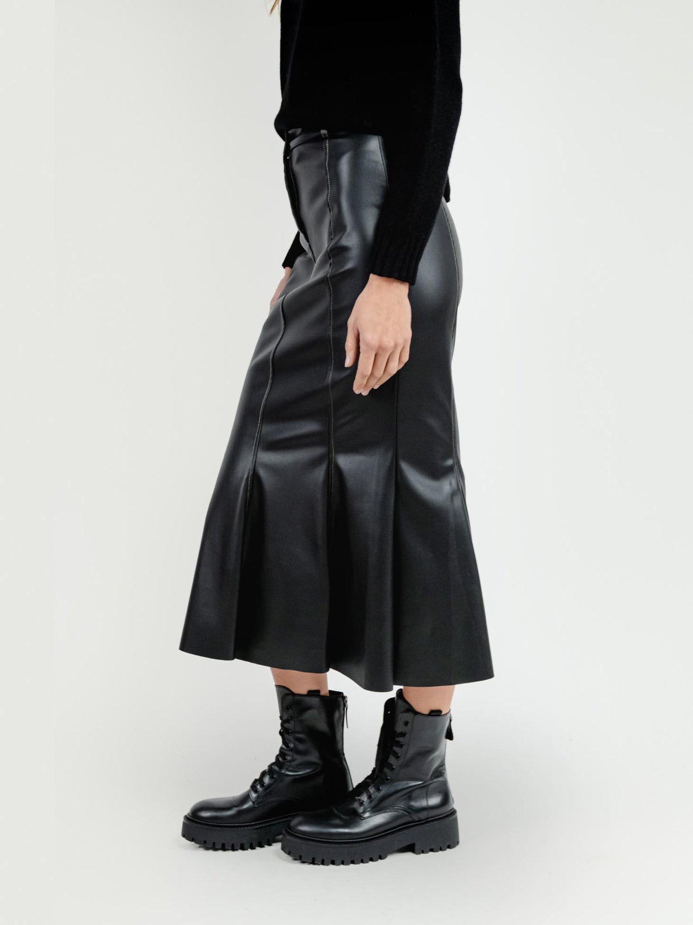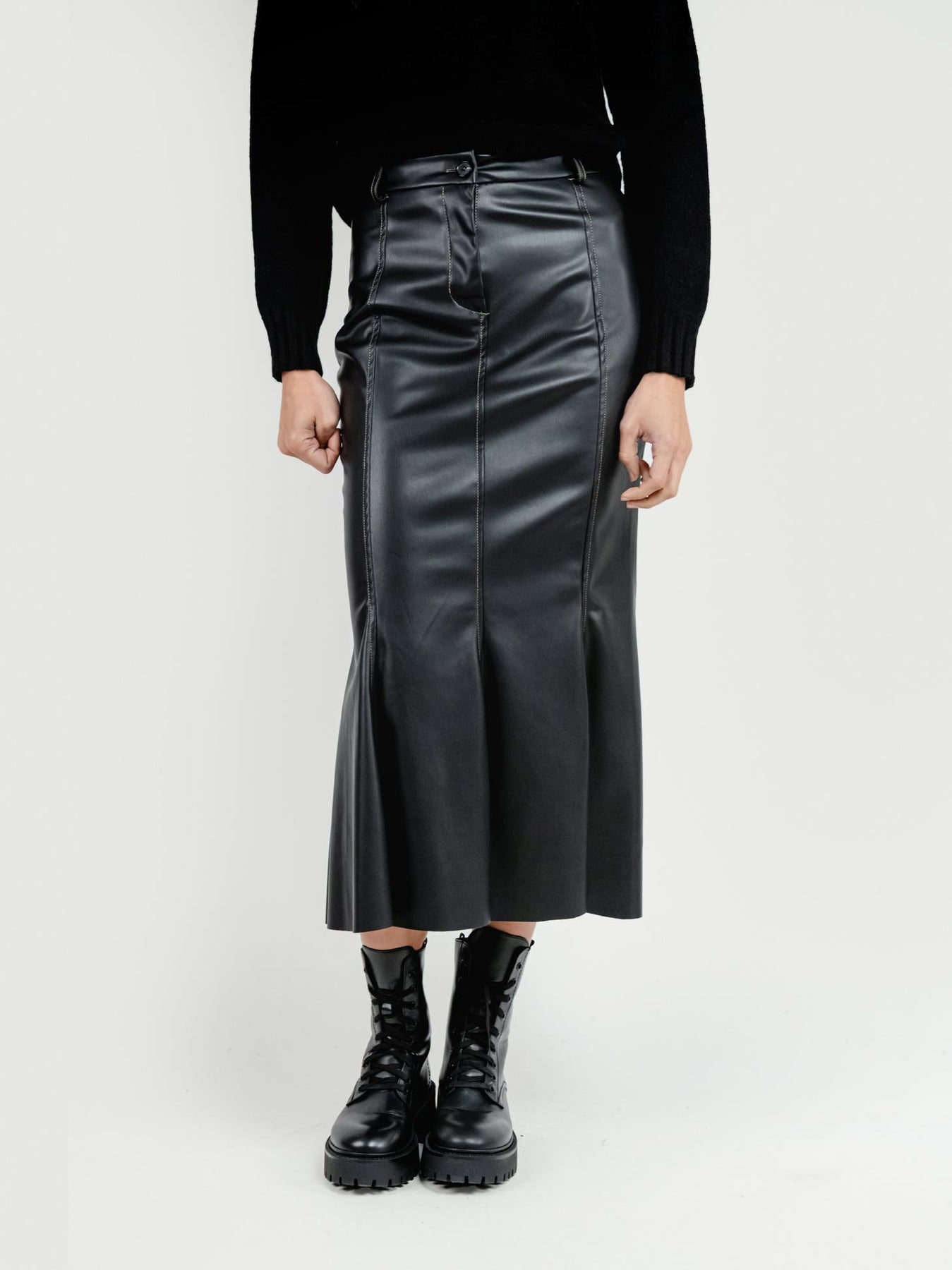 Longuette in ecopelle con balze sul fondo. Dettaglio cuciture contrasto. Chiusura a bottone con zip a scomparsa. La modella è alta 178 cm e indossa la taglia XS. Composizione: 50% PL, 50% poliuretanica. Made in Italy. Designer: Andrea Morando.