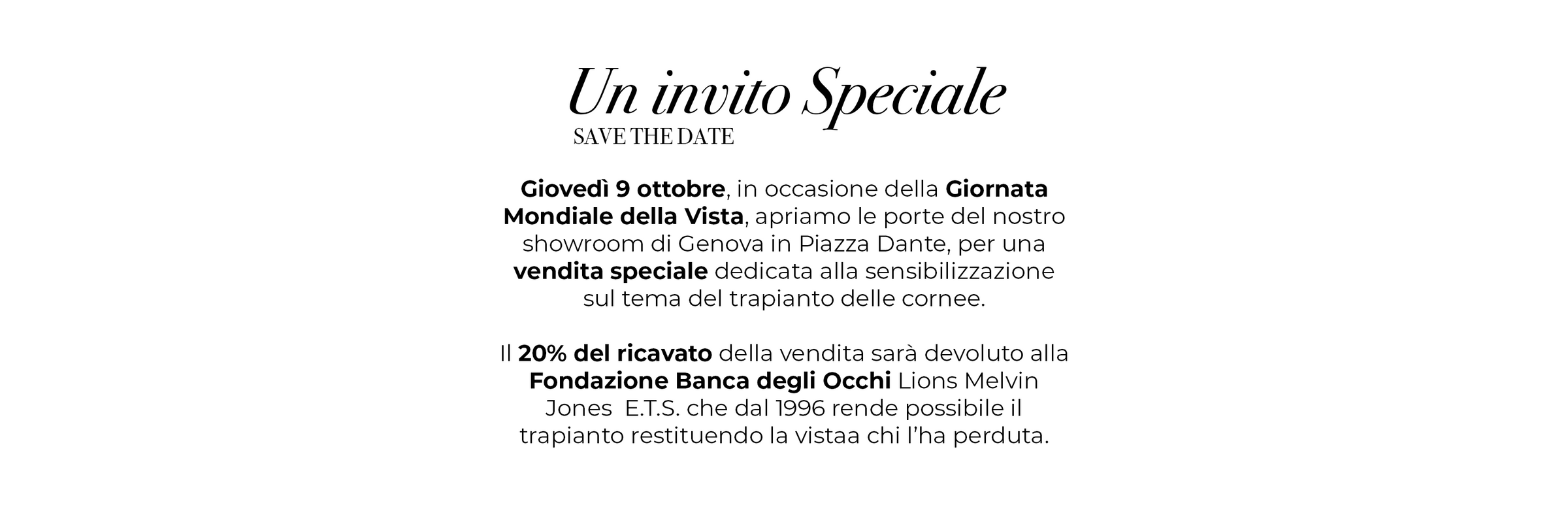 Il 20% del ricavato sarà devoluto alla Fondazione Banca degli Occhi Lions Melvin Jones