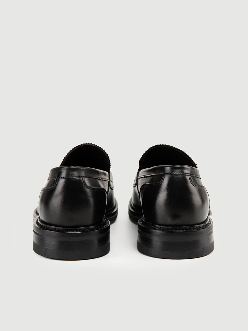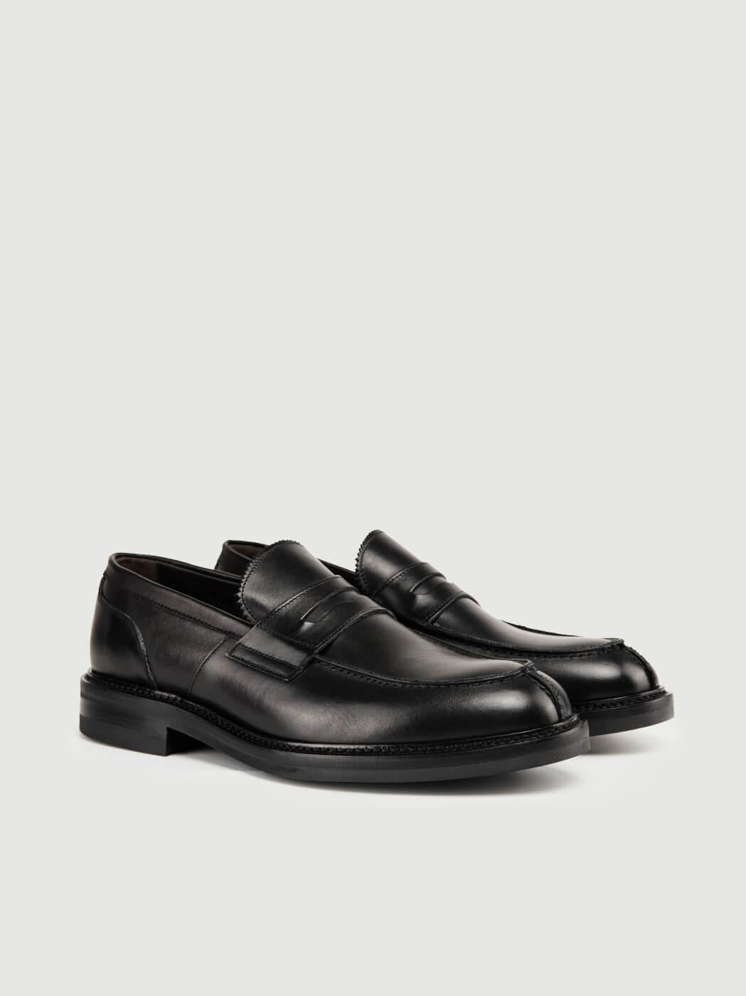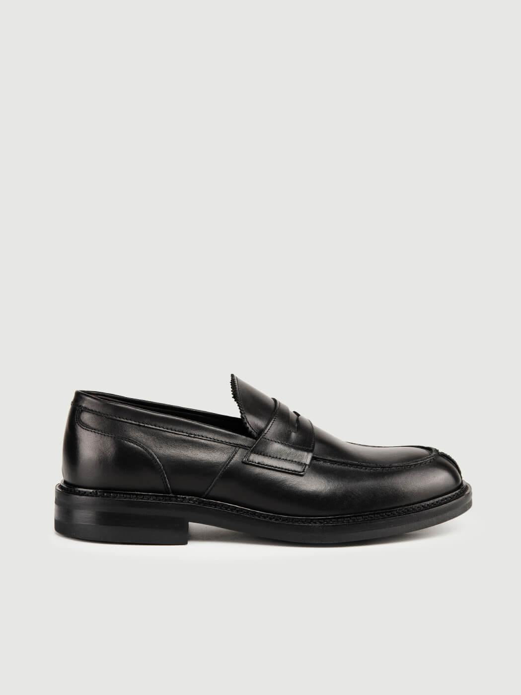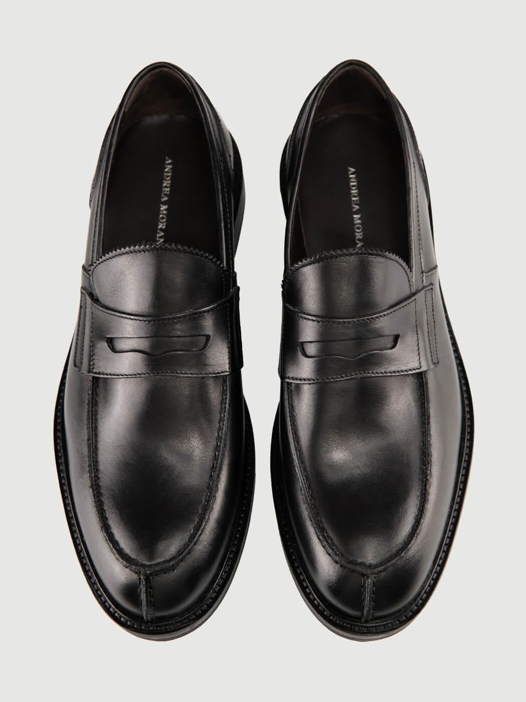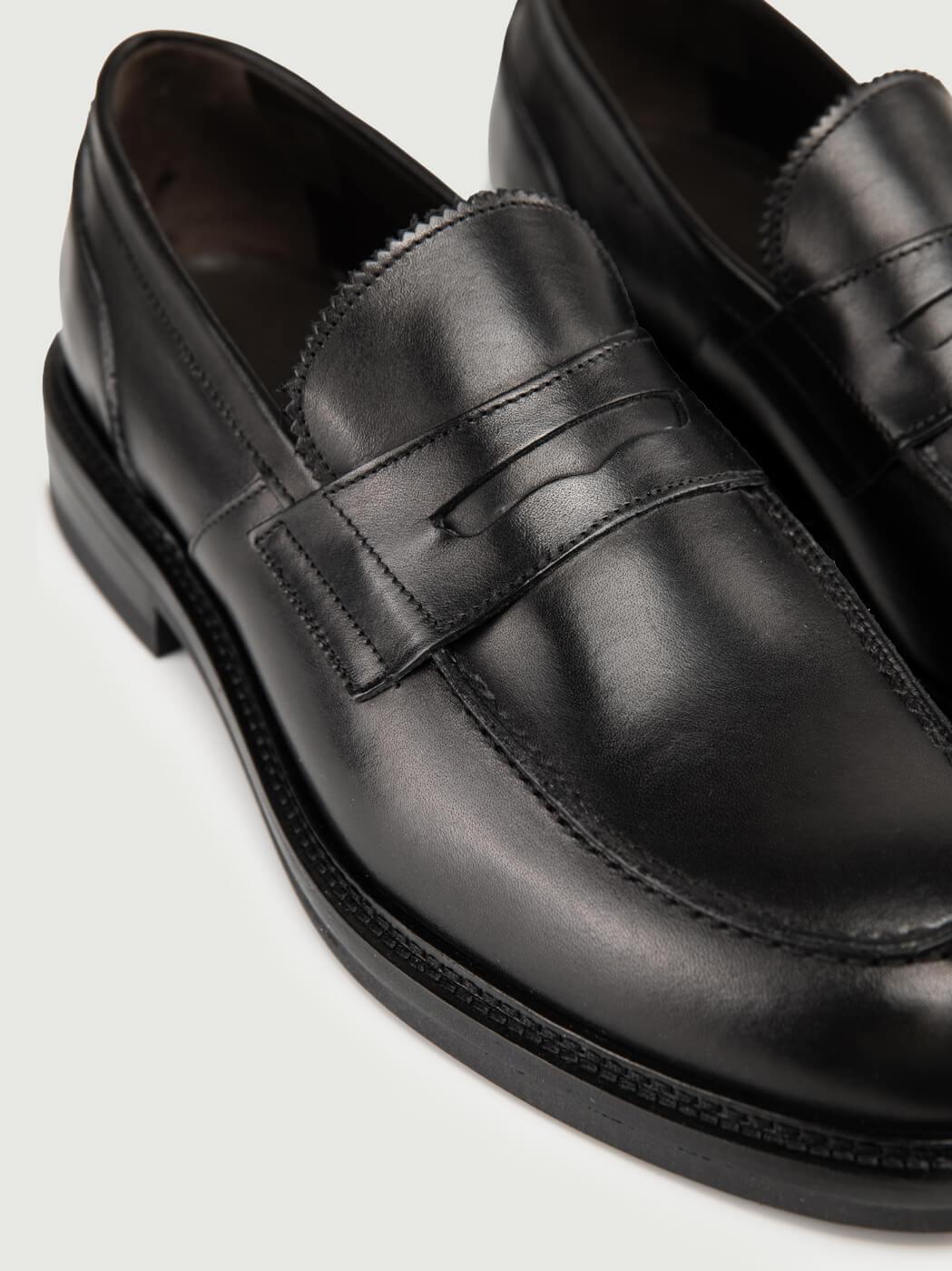 Mocassino penny in pelle di vitello nera. Realizzato con suola in gomma dainite. Fodera interna in pelle di vitello. Made in Italy.