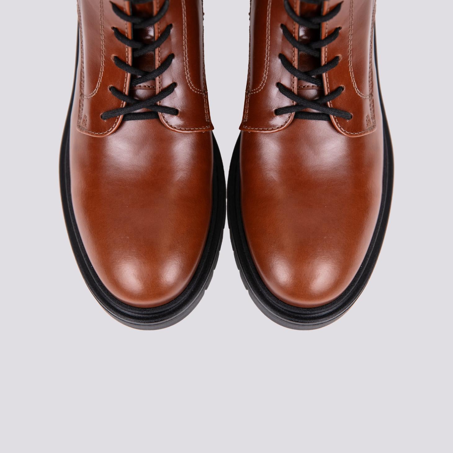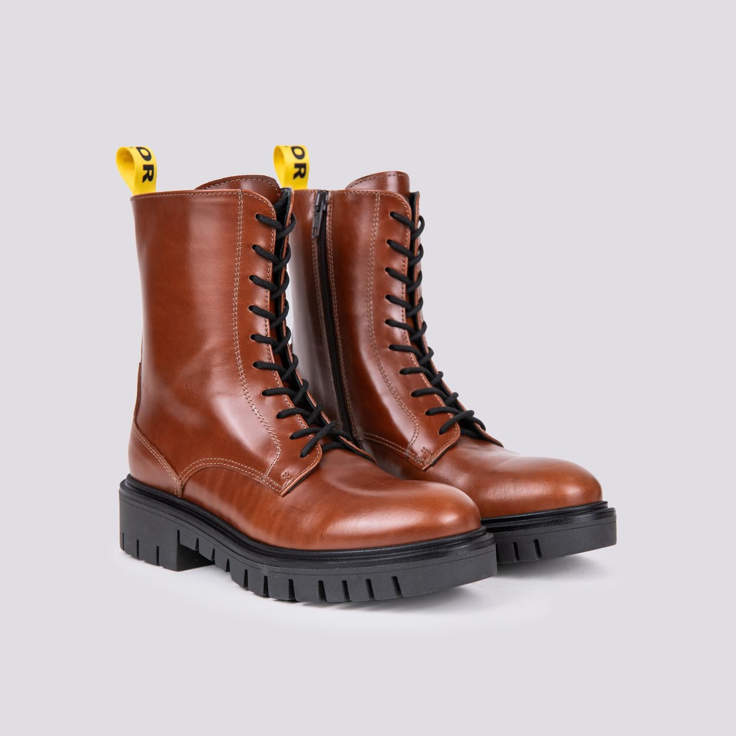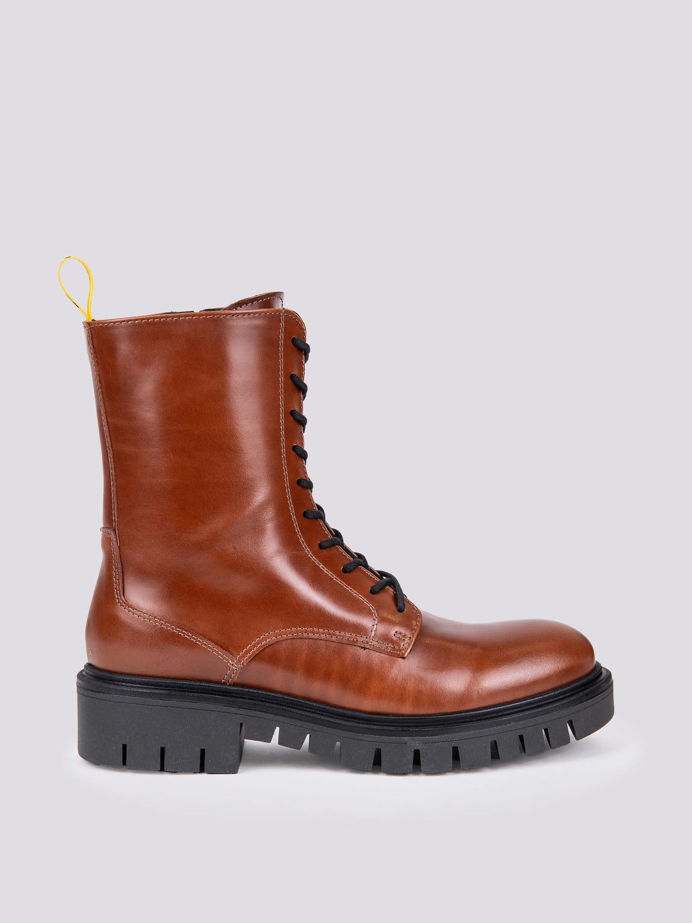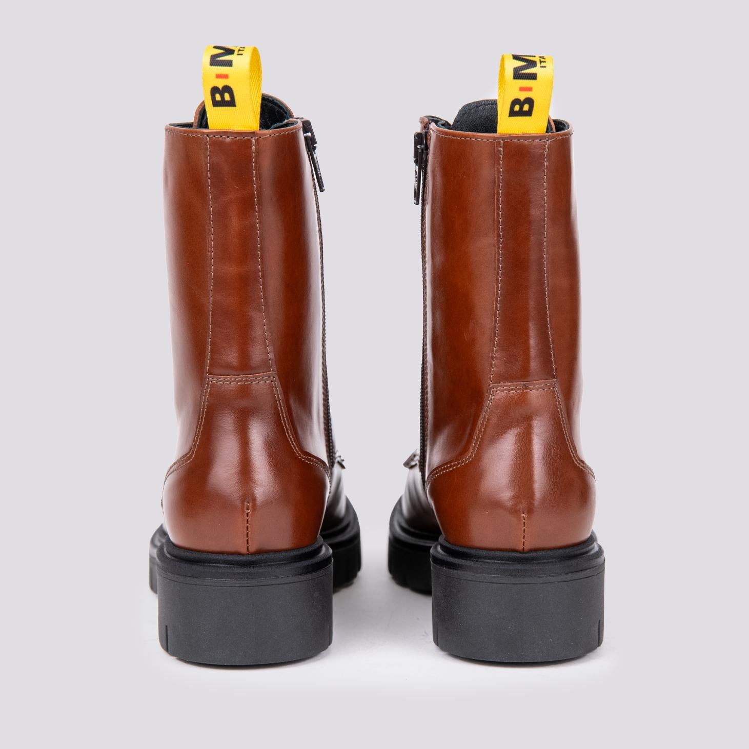 Anfibio allacciato in pelle spazzolata color bruciato. Zip laterale sulla parte interna e allacciatura lungo tutto il collo del piede. Altezza para: 3.5 cm. Cuciture in tonalità. Calzata regolare. Tomaia e fodera in vera pelle. Suola in gomma. Tiretto in tessuto giallo con logo BiMOR stampato.