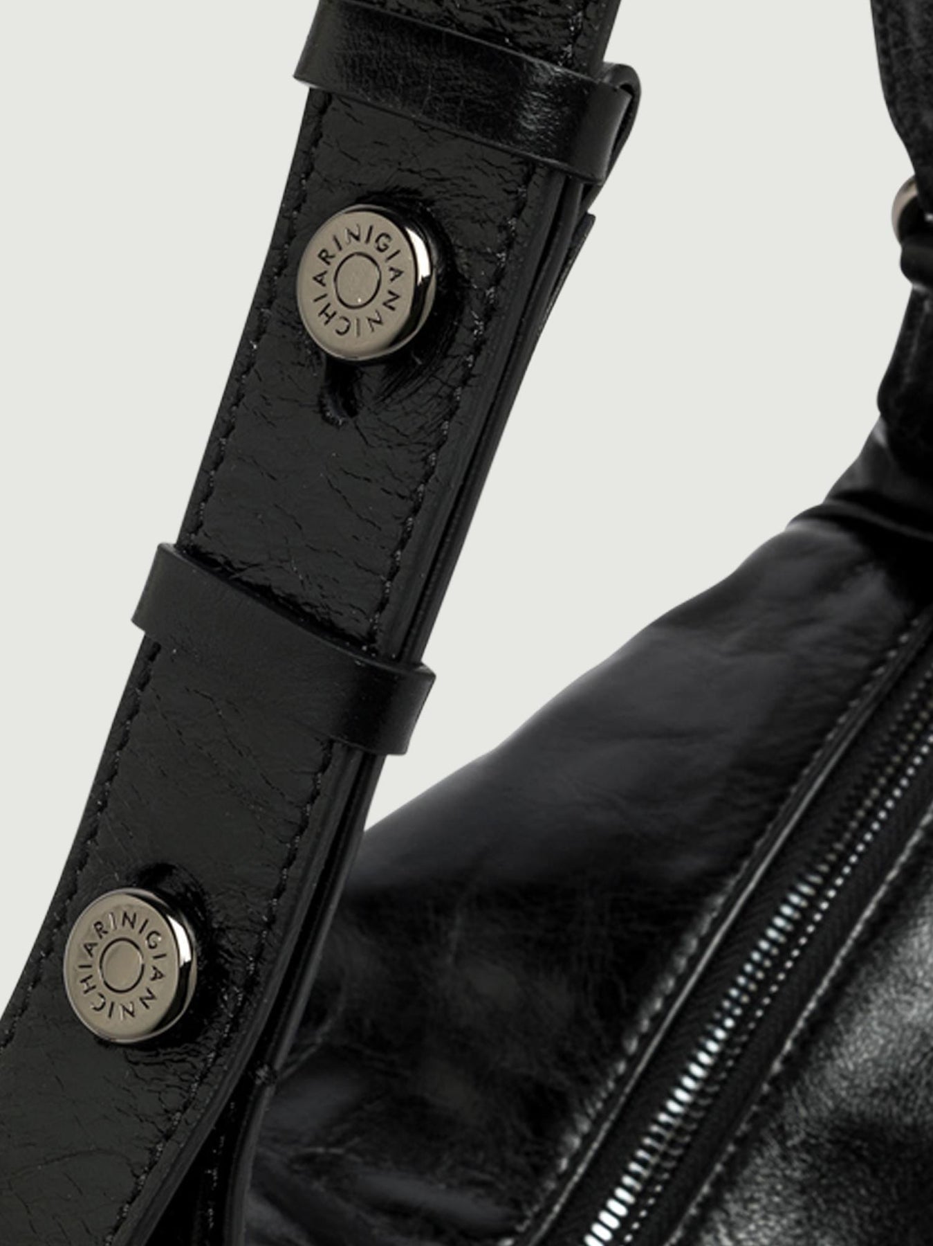 Borsa a spalla Charlotte in pelle effetto vintage, forma hobo. Ampio scomparto principale con zip e tirazip in pelle con dettagli metallici. Manico regolabile. Dimensioni: 30x21x12,5 cm. Designer: Gianni Chiarini