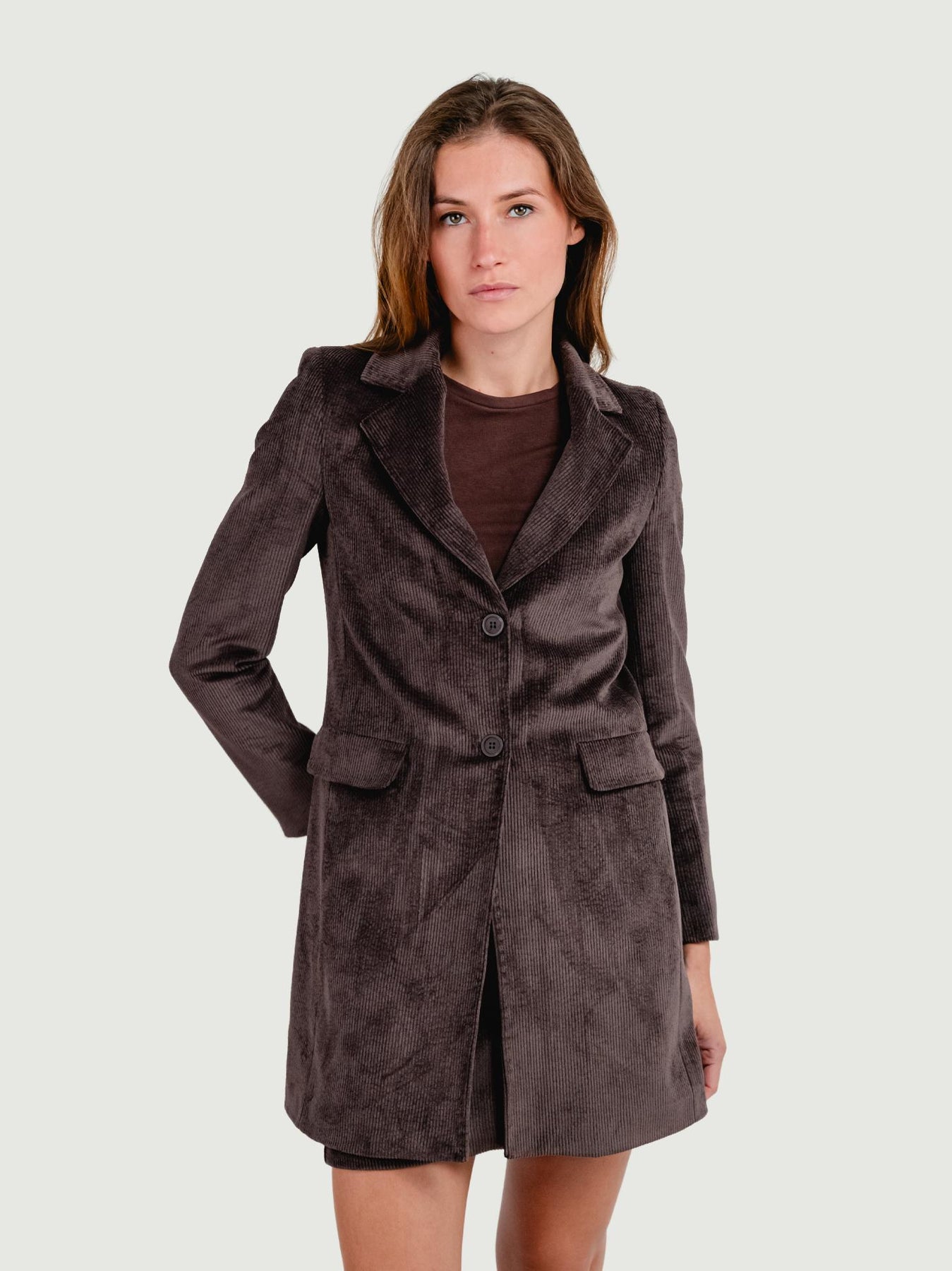 Cappotto monopetto in velluto a coste. Due tasche a pattina. Fodera interna. Chiusura a 2 bottoni. La modella è alta 178 cm e indossa la taglia XS. Composizione: 85% PL, 12% nylon, 3% EL. Made in Italy. Designer: Andrea Morando