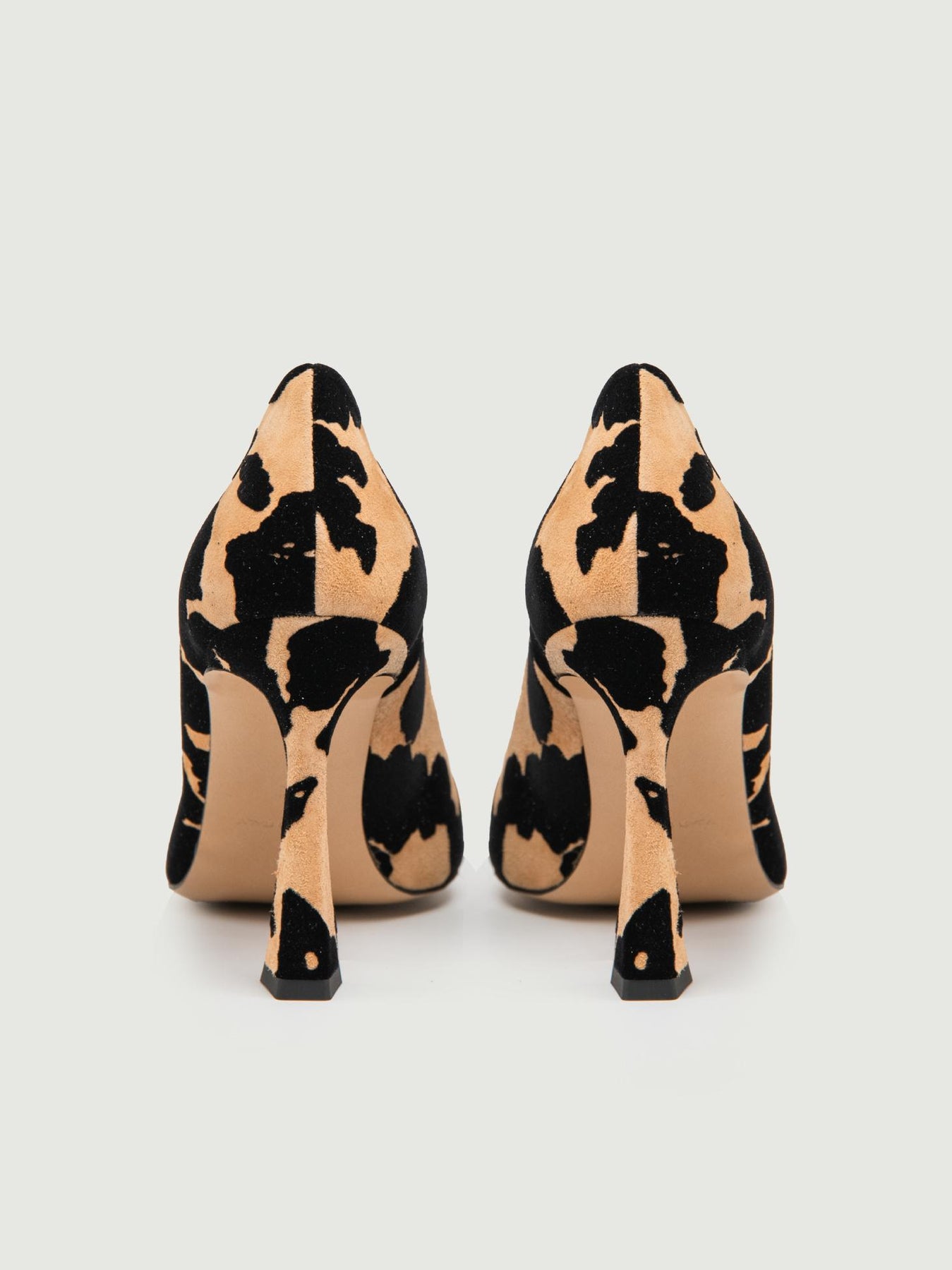 Décolleté in pelle scamosciata cuoio con fantasia muccata realizzata tramite inserti di velluto nero. Tacco a rocchetto. Altezza tacco: 10,5 cm. Tomaia: pelle scamosicata. Fodera: pelle. Suola: gomma. Made in Italy Designer: Andrea Morando.