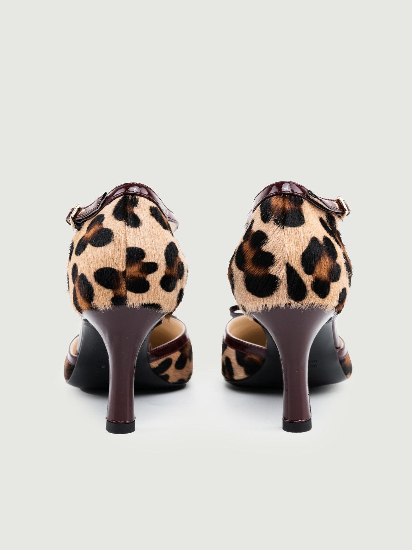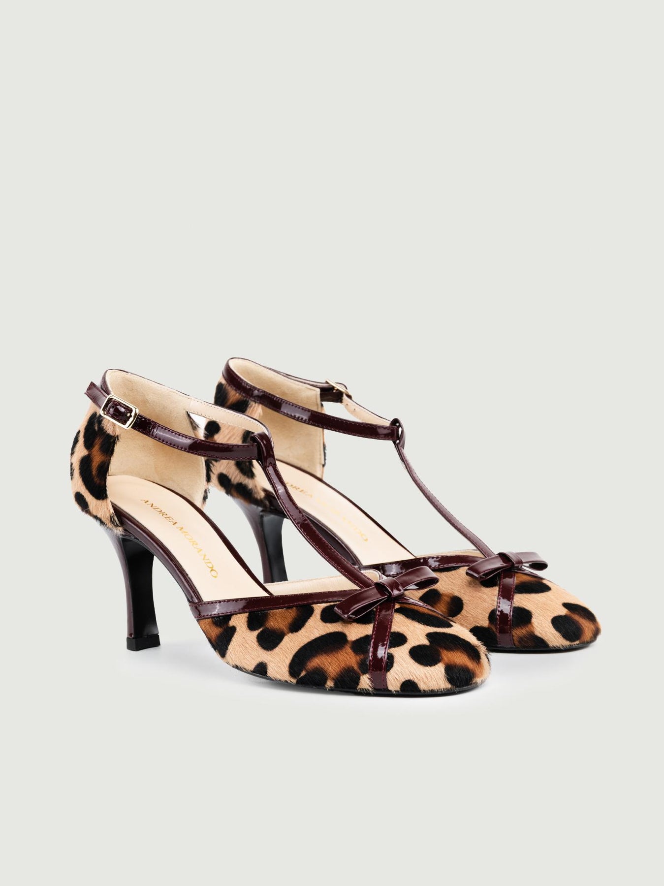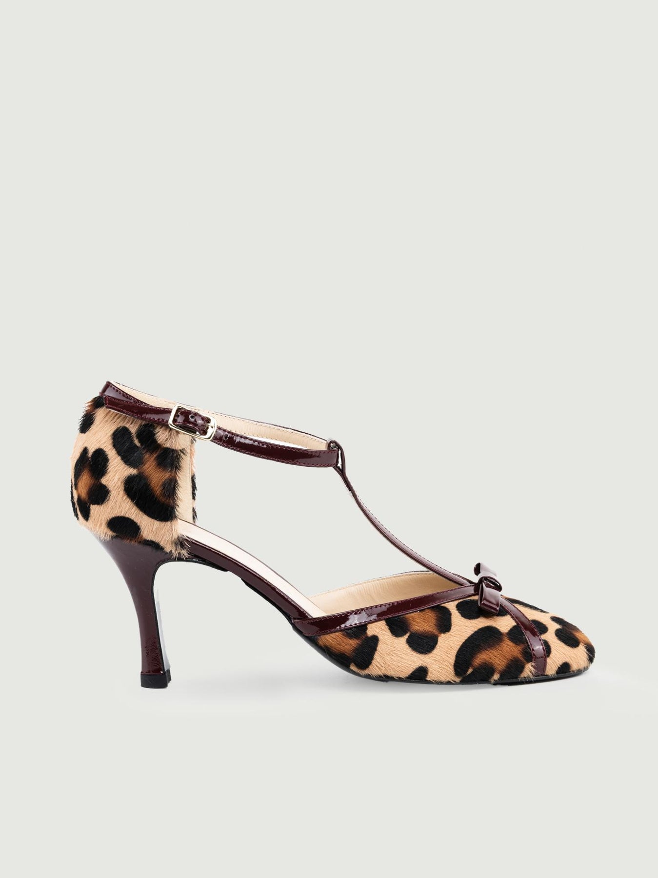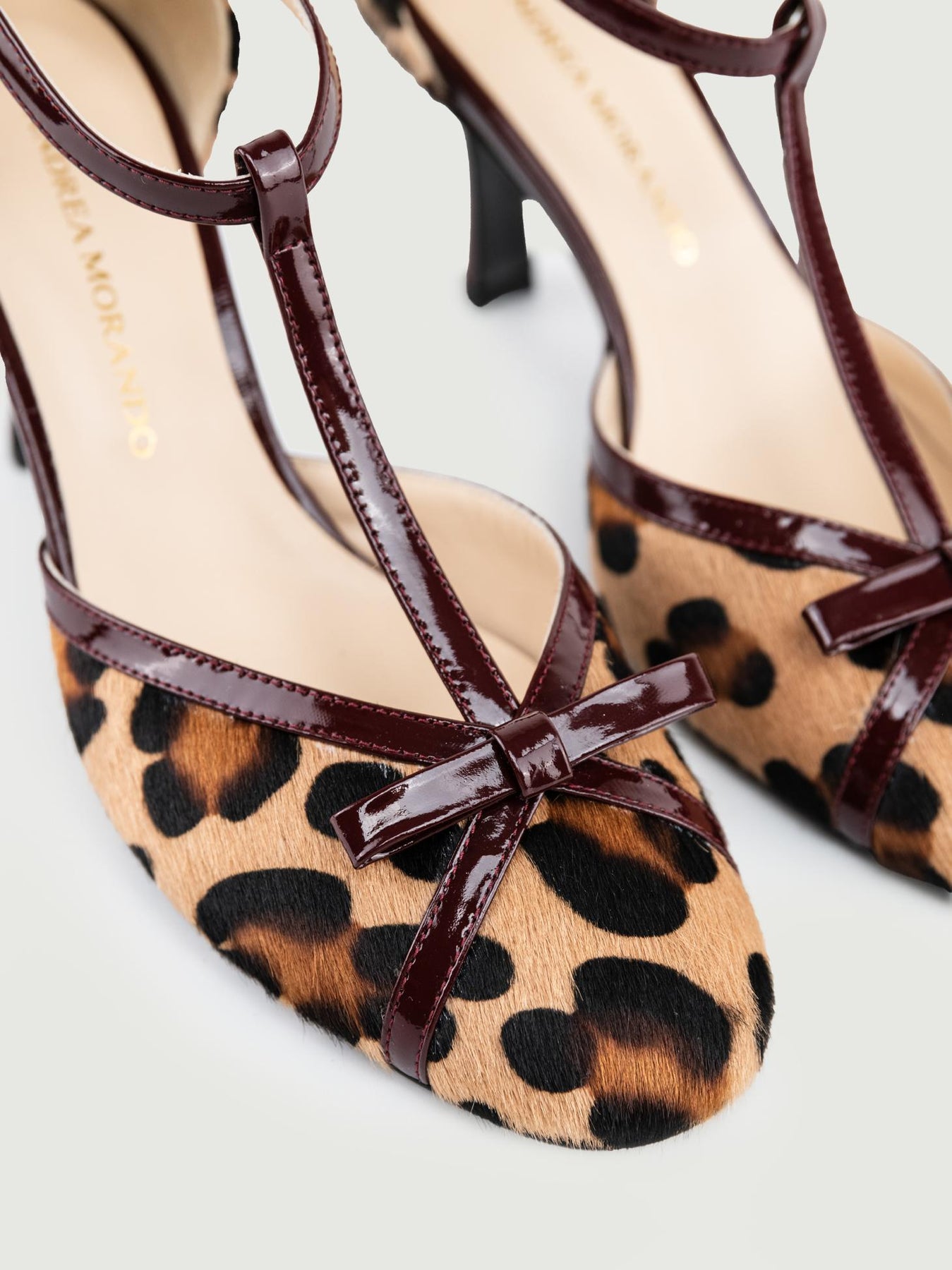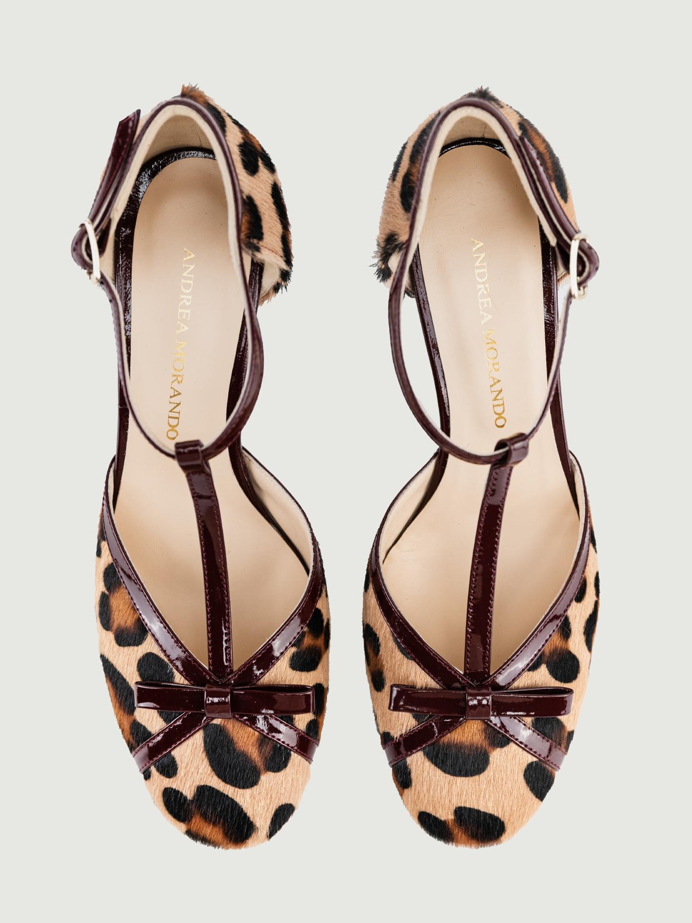 Décolleté in cavallino maculato con listino a T sul collo del piede e dettaglio fiocchetto in pelle vernice bordeaux.
