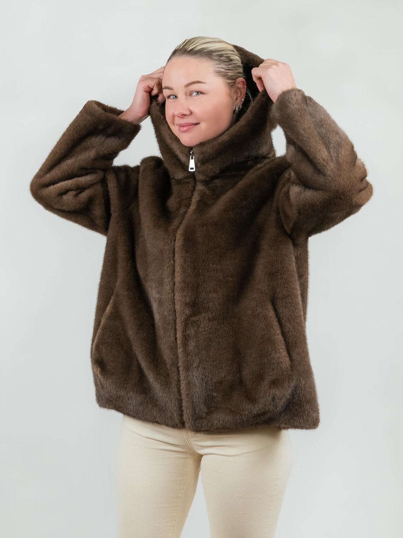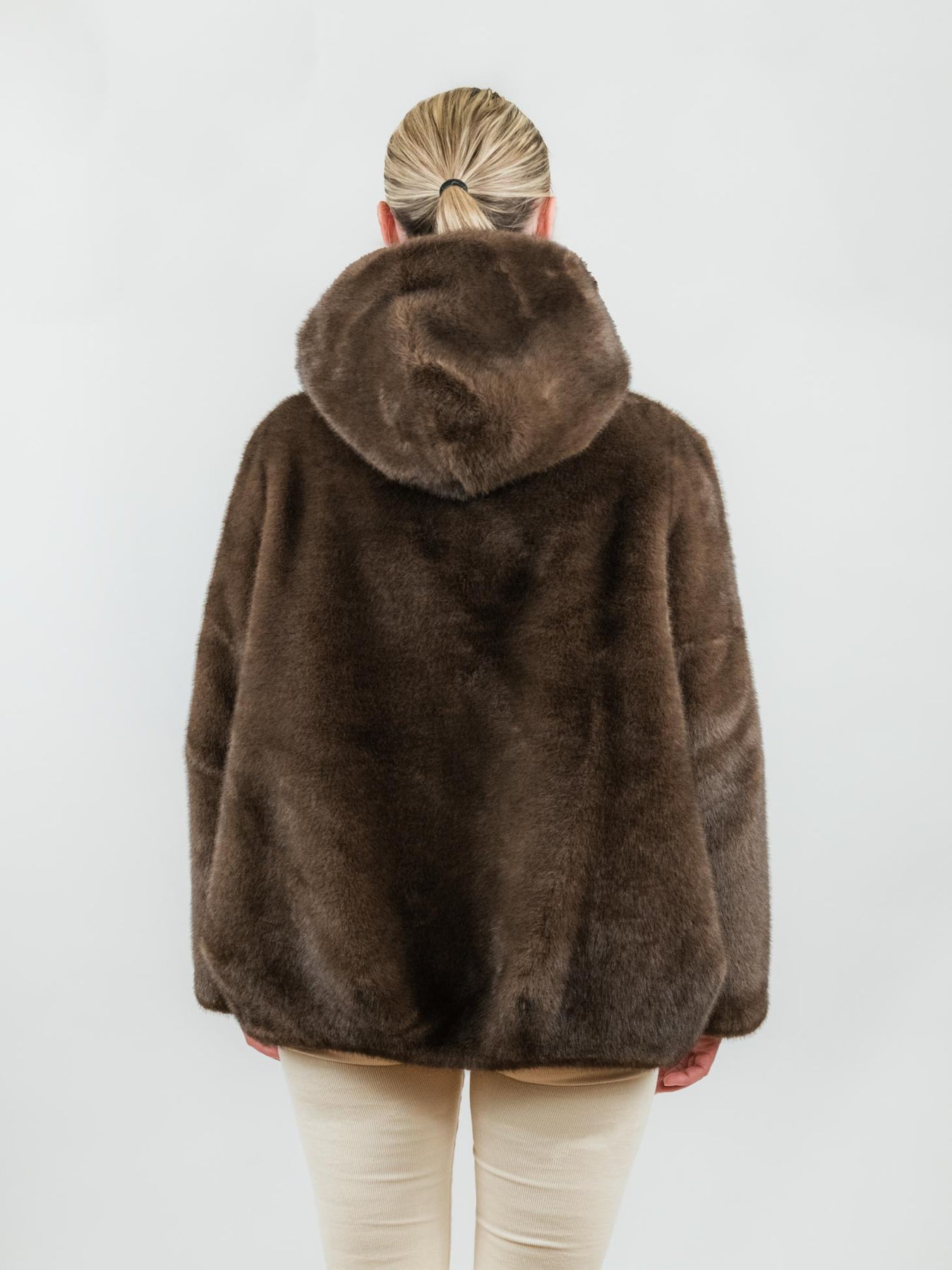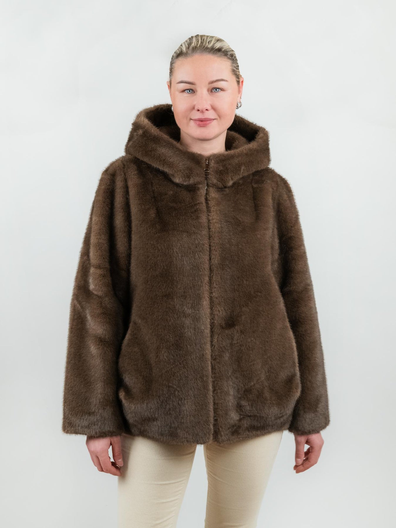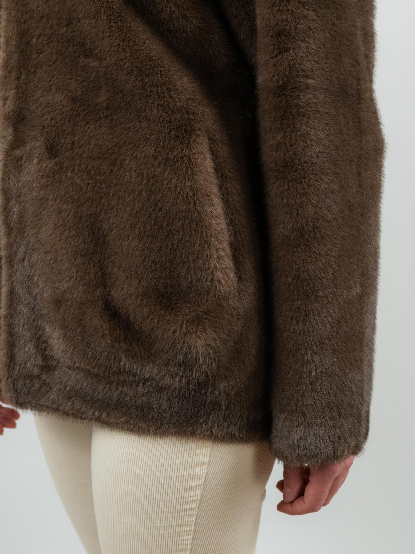 Ecopelliccia con cappuccio. Chiusura con zip. Tasche laterali a filetto. Maniche leggermente svasate. Composizione: 100% fibre sintetiche Designer: Andrea Morando