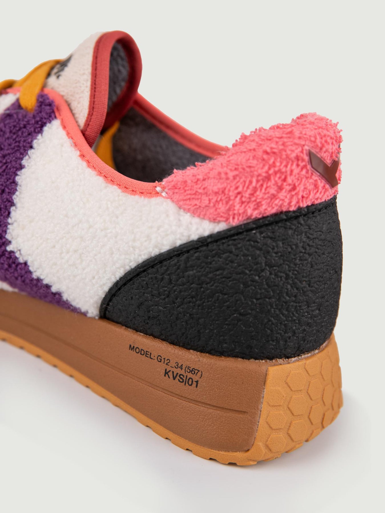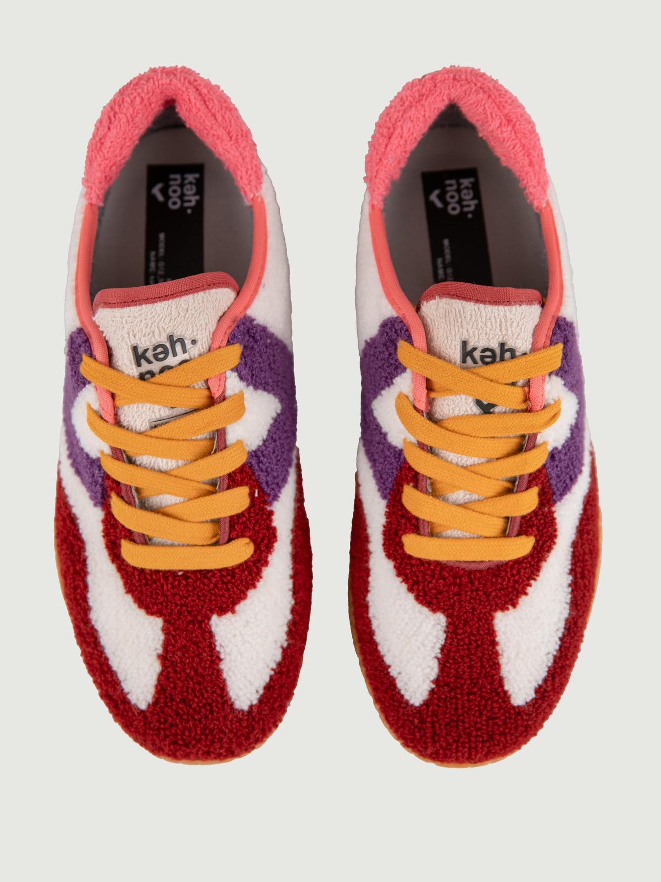 Sneakers multicolor con tomaia in materiale floccato rosso, bianco, viola e rosa.