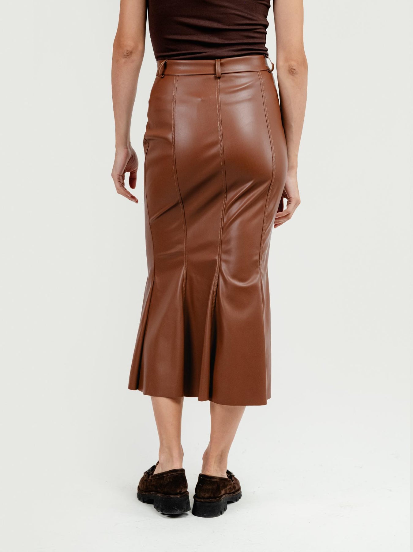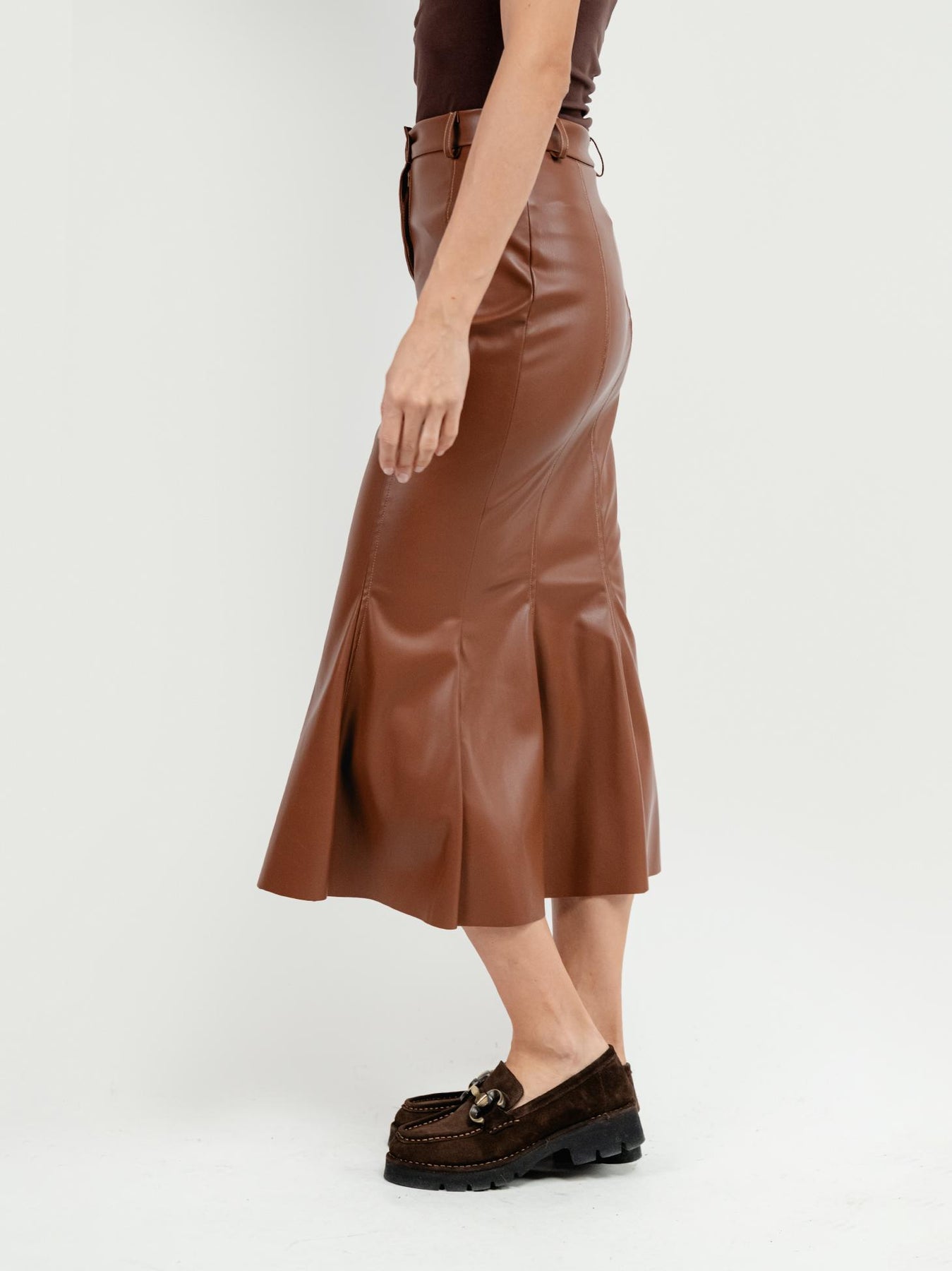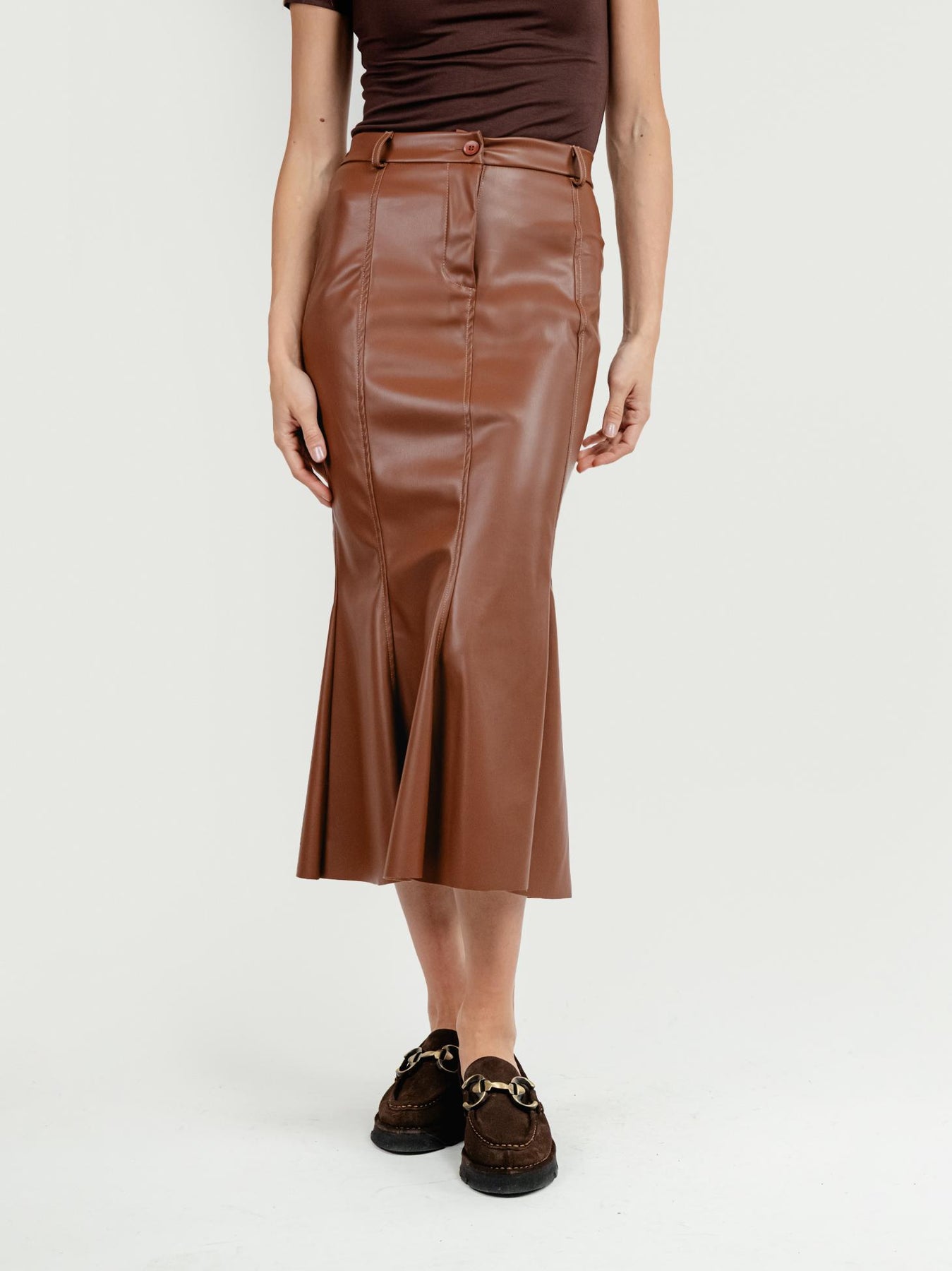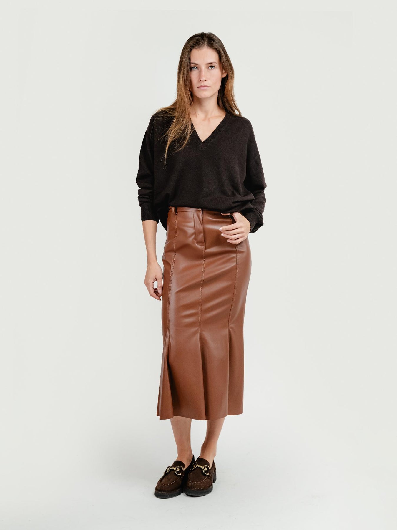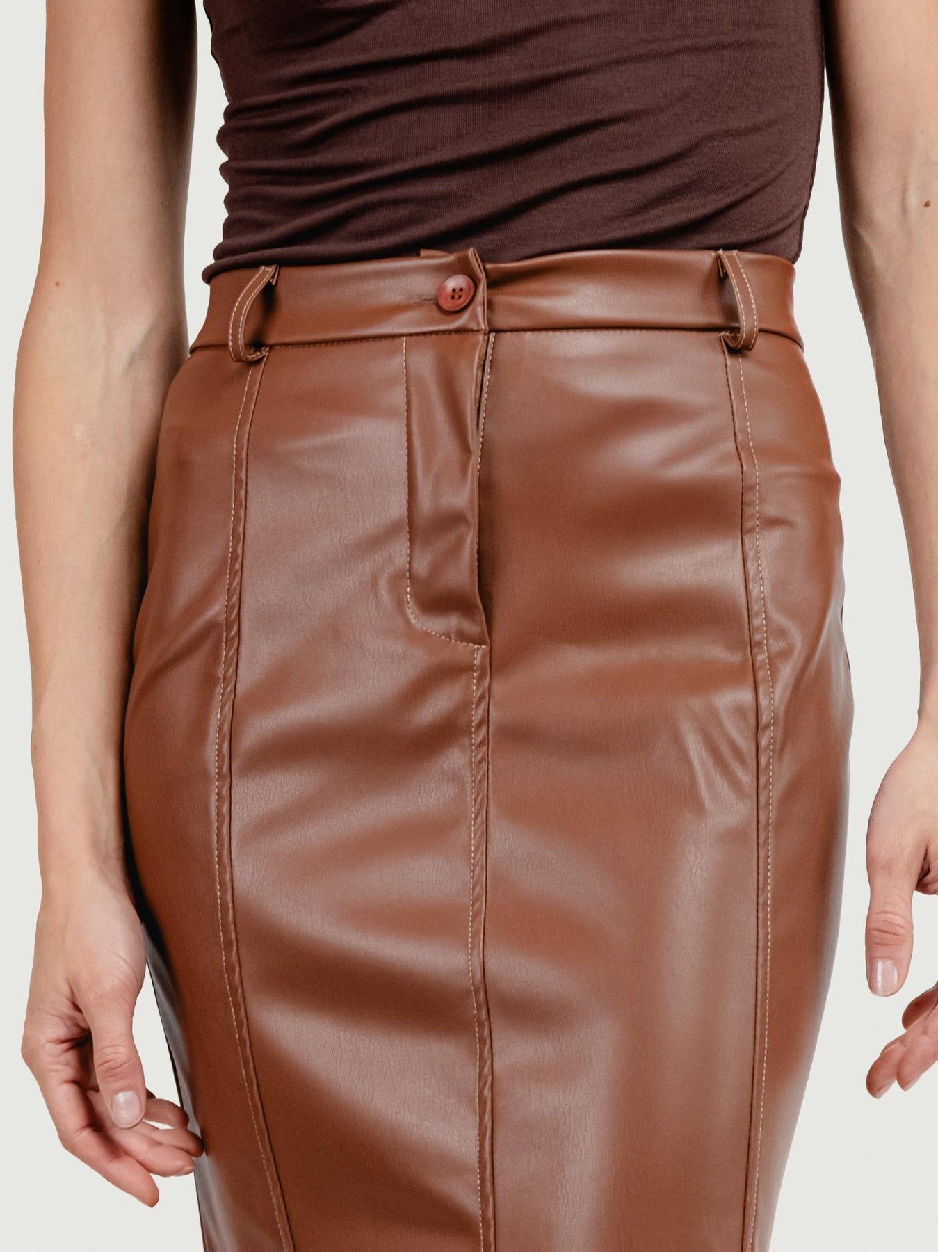 Longuette in ecopelle con balze sul fondo. Dettaglio cuciture contrasto. Chiusura a bottone con zip a scomparsa. La modella è alta 178 cm e indossa la taglia XS. Composizione: 50% PL, 50% poliuretanica. Made in Italy. Designer: Andrea Morando.