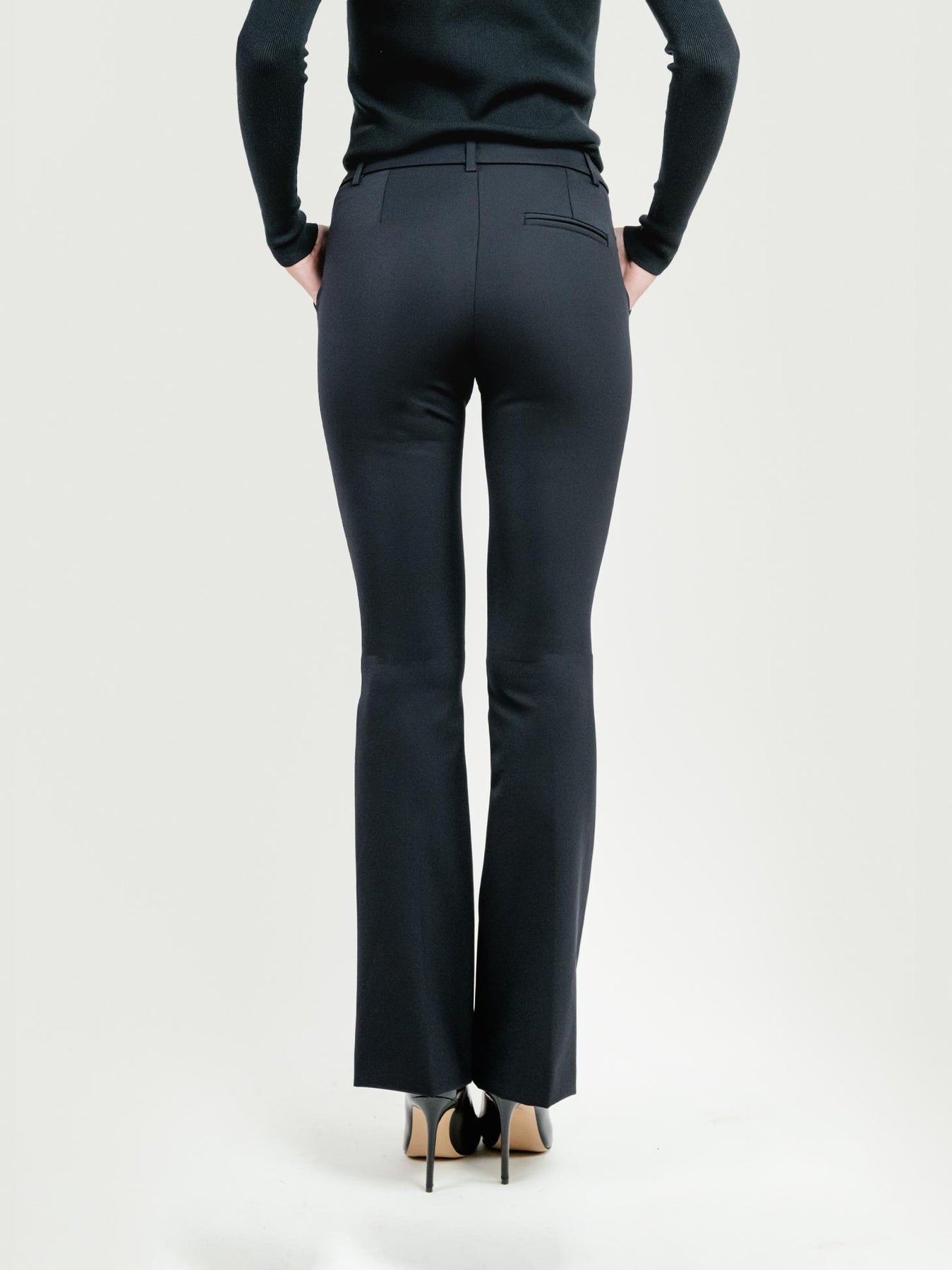 Pantalone a zampa in tessuto elasticizzato. Chiusura a bottone con zip a scomparsa. Tasche a filo e tasca a filetto posteriore. La modella è alta 178 cm e indossa la taglia S. Composizione: 95% nylon, 5% elastico . Made in Italy. Designer: Andrea Morando