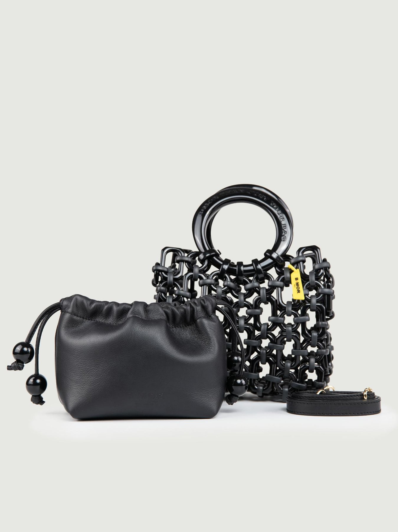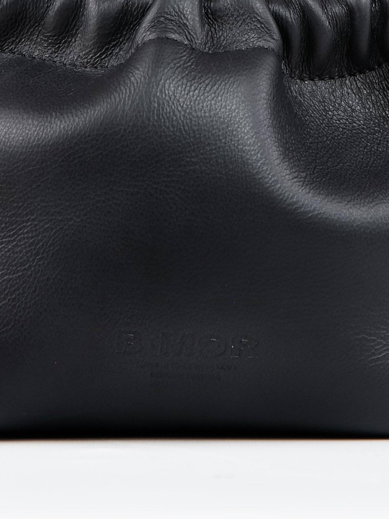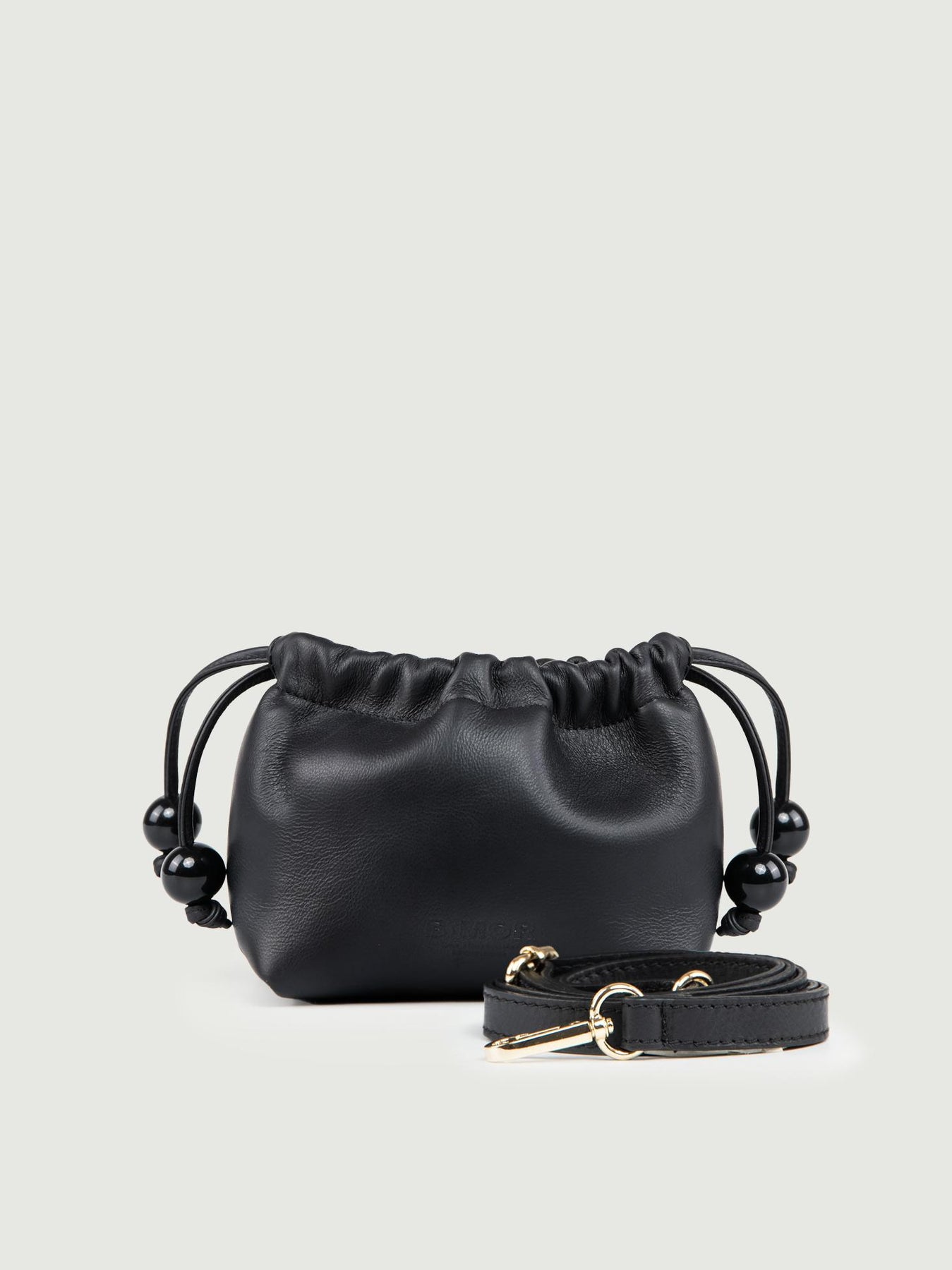 Pochette in pelle nera con tracolla. Chiusura con coulisse. Dettaglio sfere in resina in tonalità. Fodera interna nera. Tracolla 120 cm. Misure: 16 x 9 x 13 cm. Interamente disegnato e prodotta in Italia. Designer: BiMOR