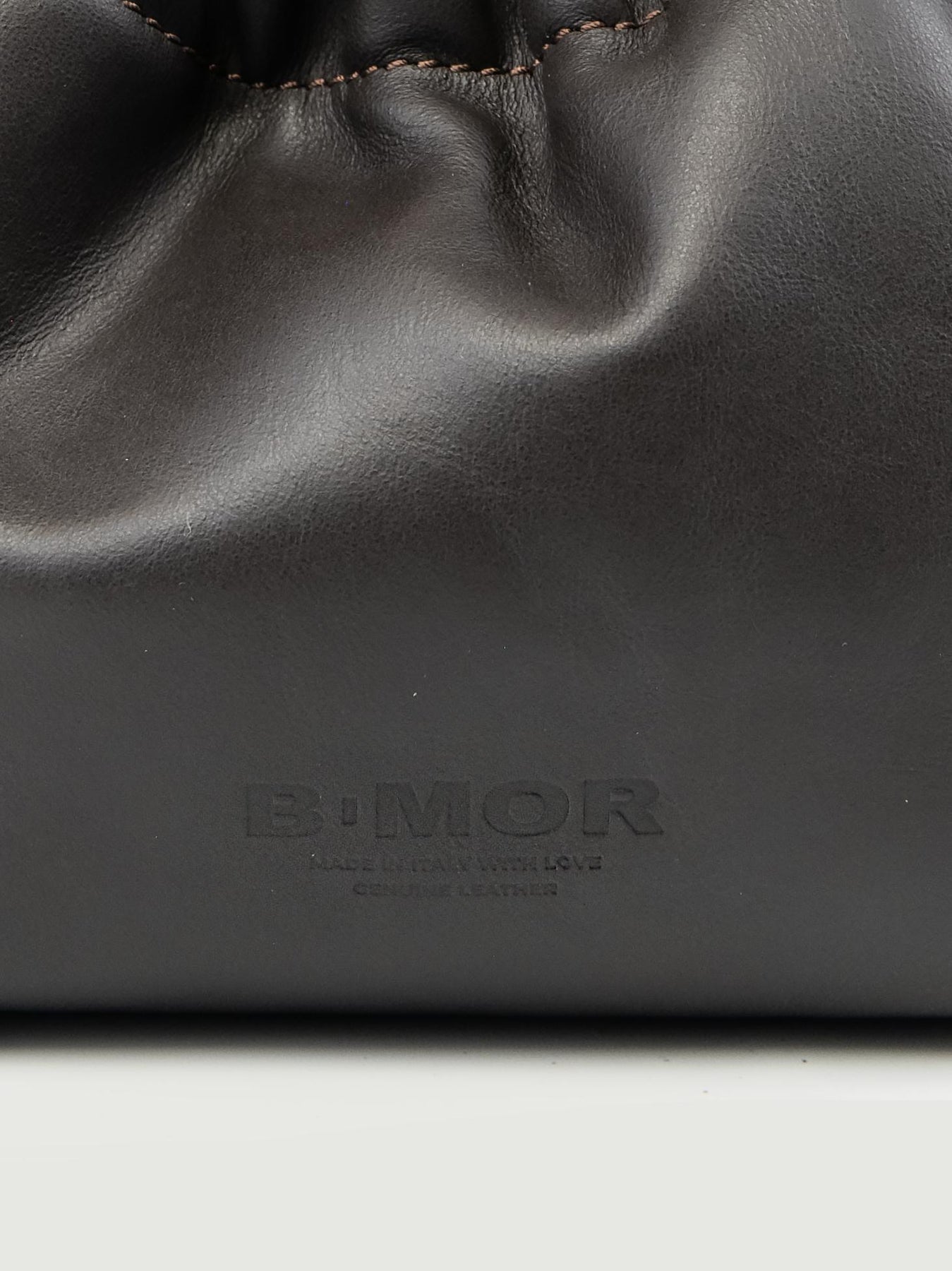 Pochette in pelle testa moro con tracolla. Chiusura con coulisse. Dettaglio sfere in resina in tonalità. Fodera interna nera. Tracolla 120 cm. Misure: 16 x 9 x 13 cm. Interamente disegnato e prodotta in Italia. Designer: BiMOR