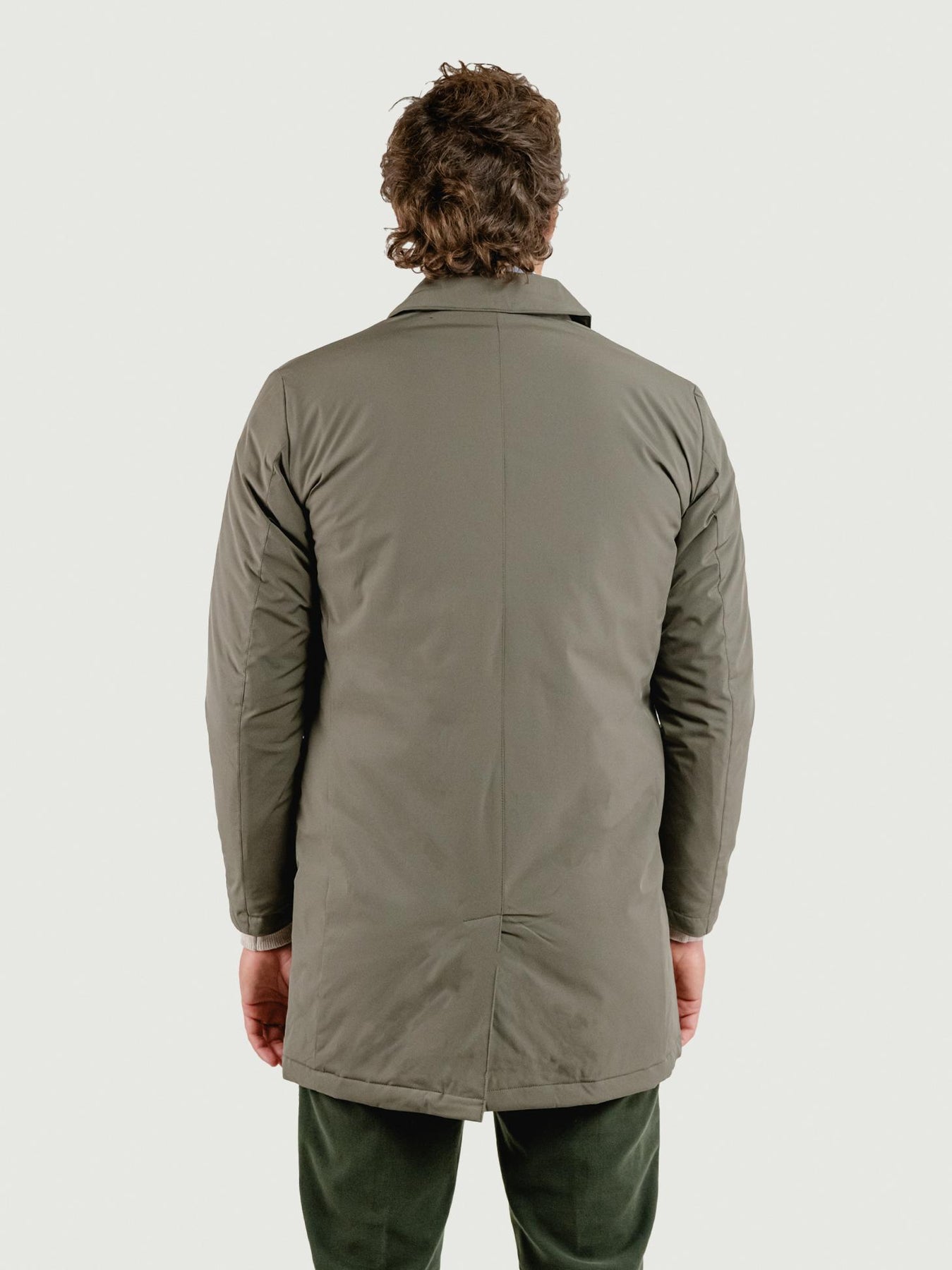 Spolverino in nylon, peso 100 gr. Chiusura con bottoni a scomparsa. Tasche a filetto. Spacco posteriore. Il modello è alto 186 cm e indossa una taglia L Designer: Andrea Morando