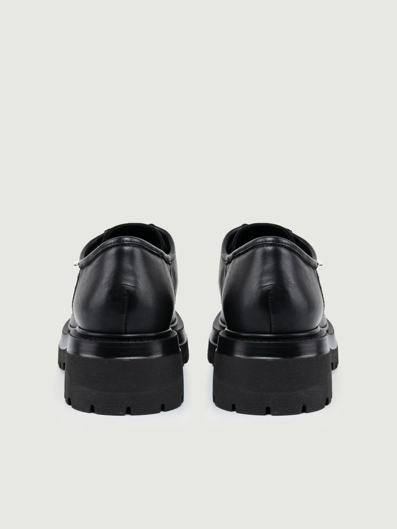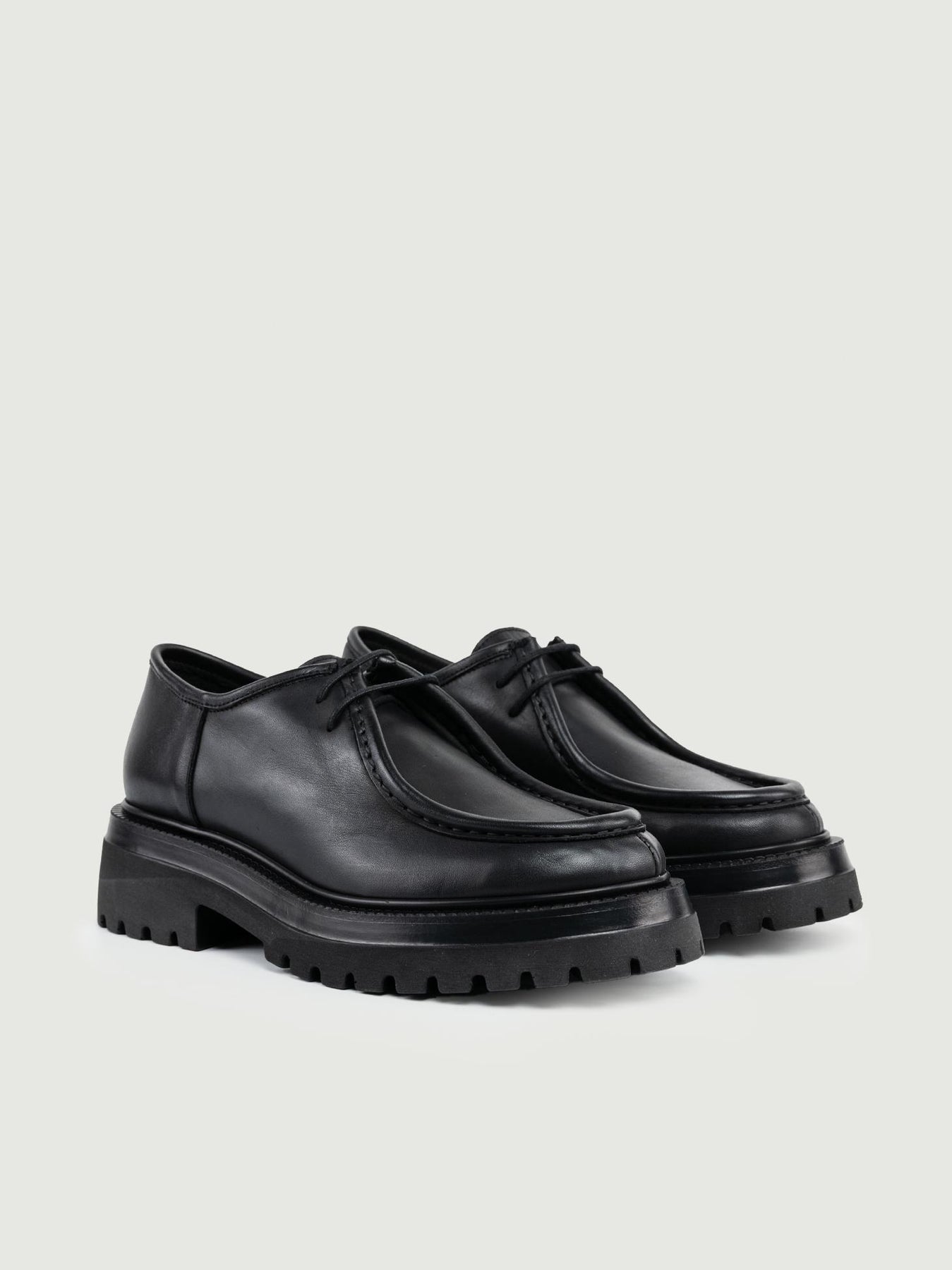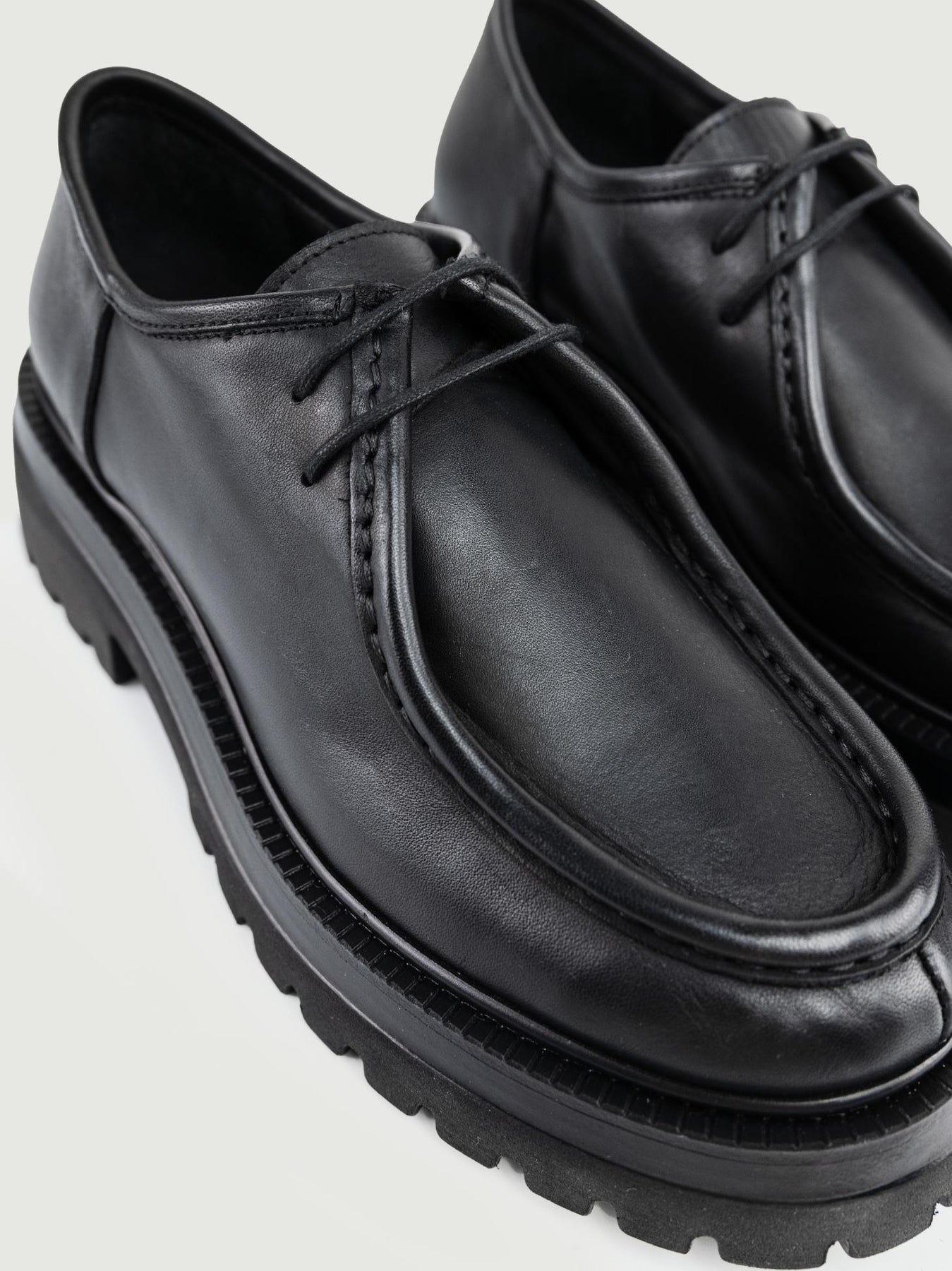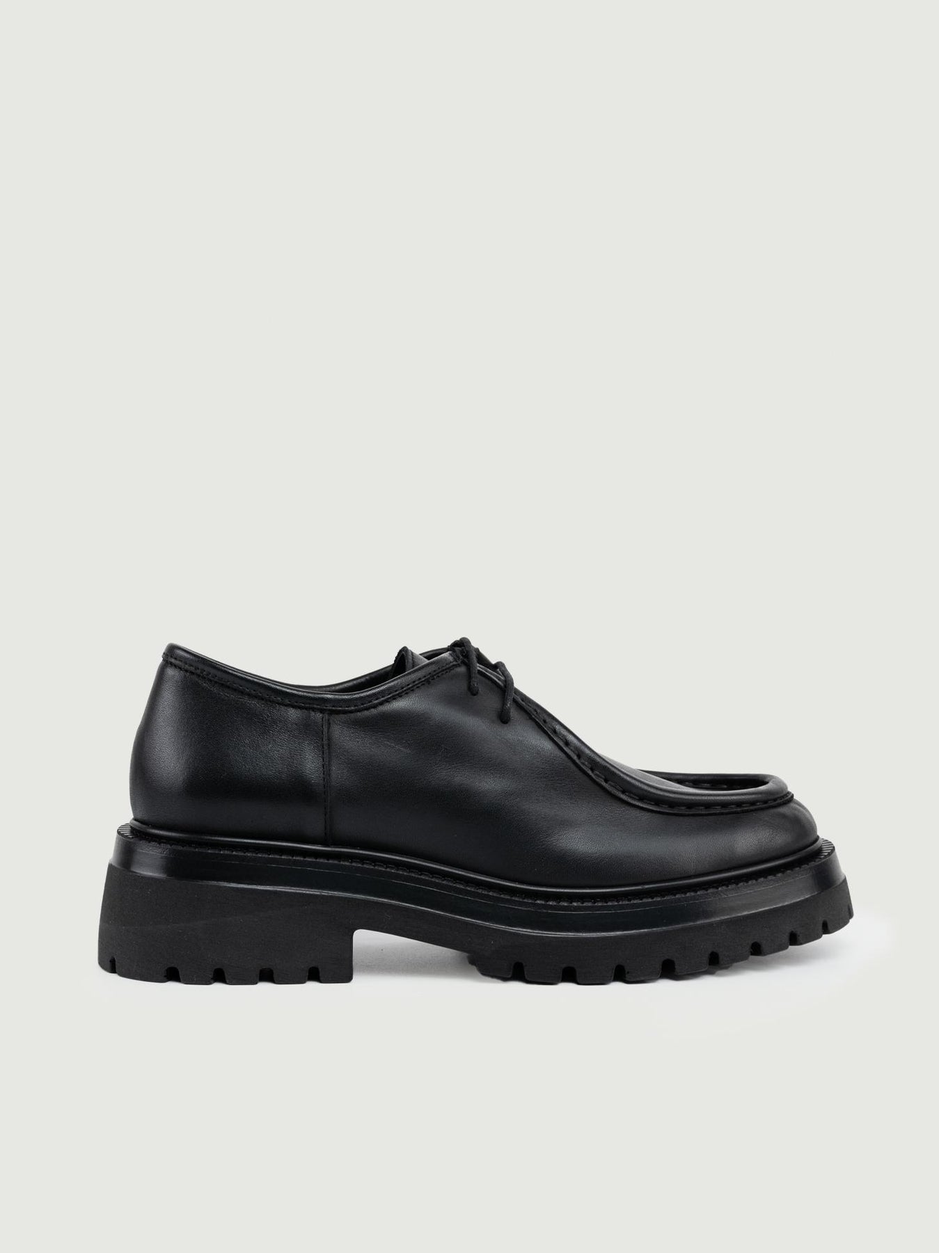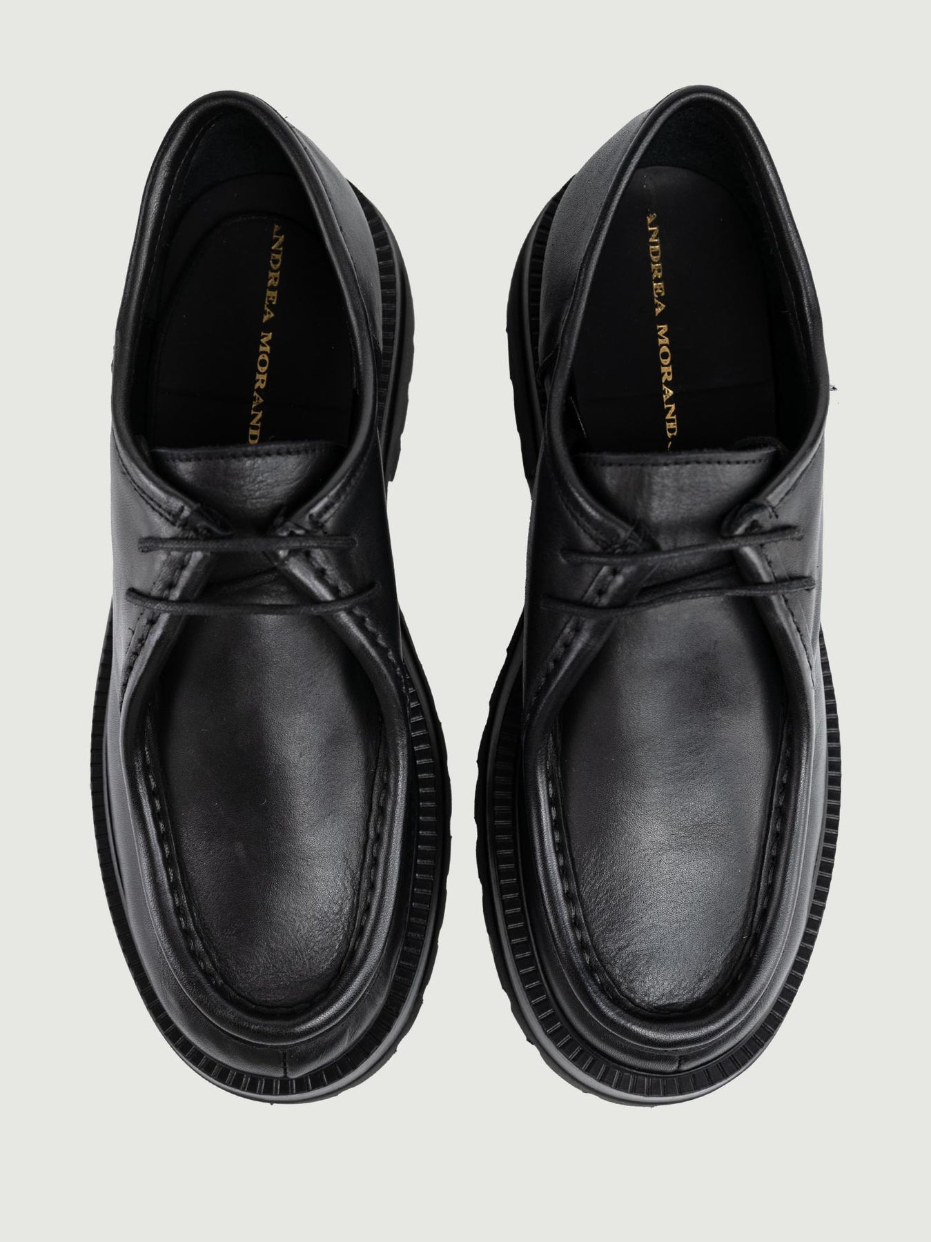 Stringata in pelle nera con cuciture in rilievo in tonalità. Guardolo rotellato. Para con carrarmato. Altezza para: 5 cm. Materiale: pelle. Fodera: pelle. Fondo: gomma. Made in Italy Designer: Andrea Morando