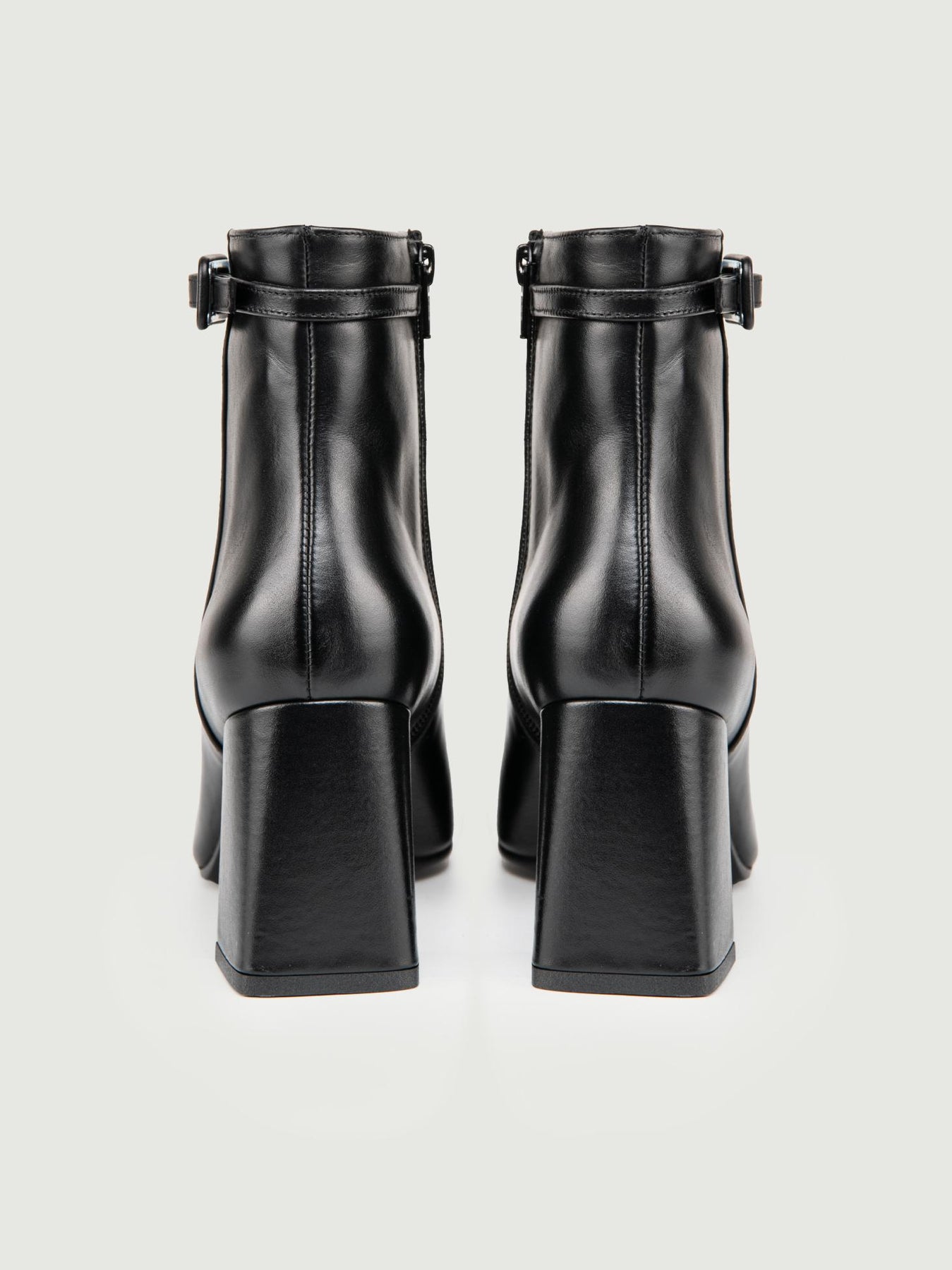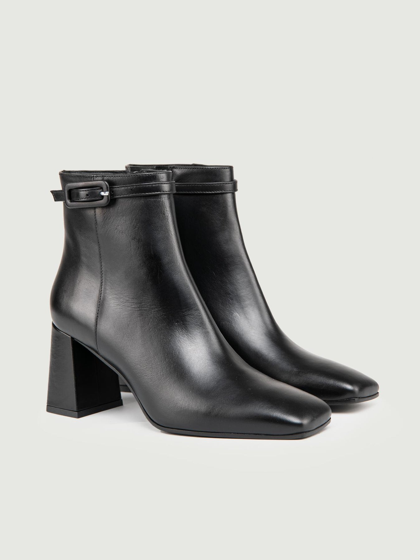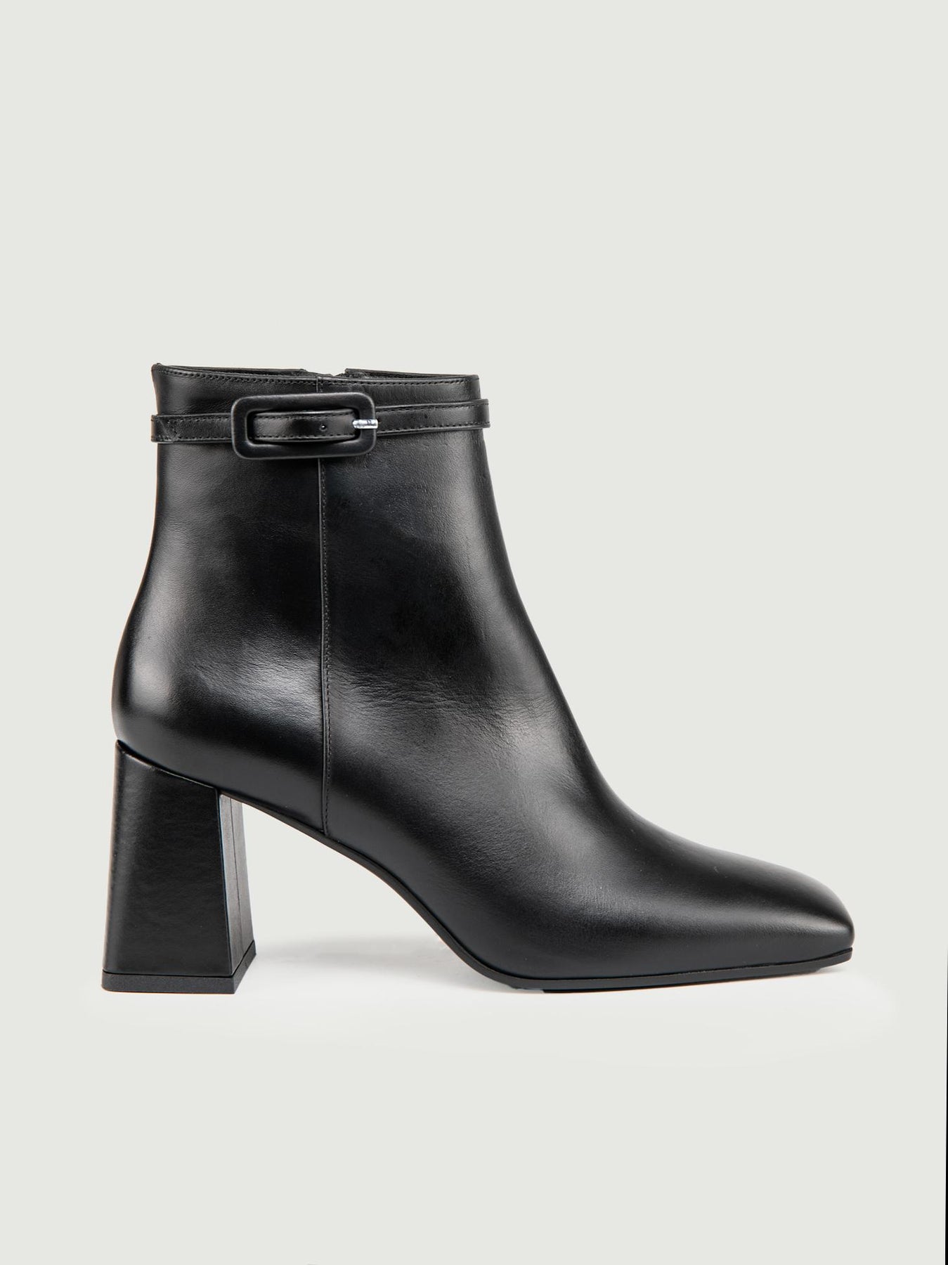 Tronchetto in pelle nero con tacco squadrato. Punta squadrata. Inserto cinturino alla caviglia con fibbia in tonalità. Altezza tacco: 8 cm. Tomaia: pelle. Fodera interna: pelle. Suola: gomma. Made in Italy. Designer: Andrea Morando