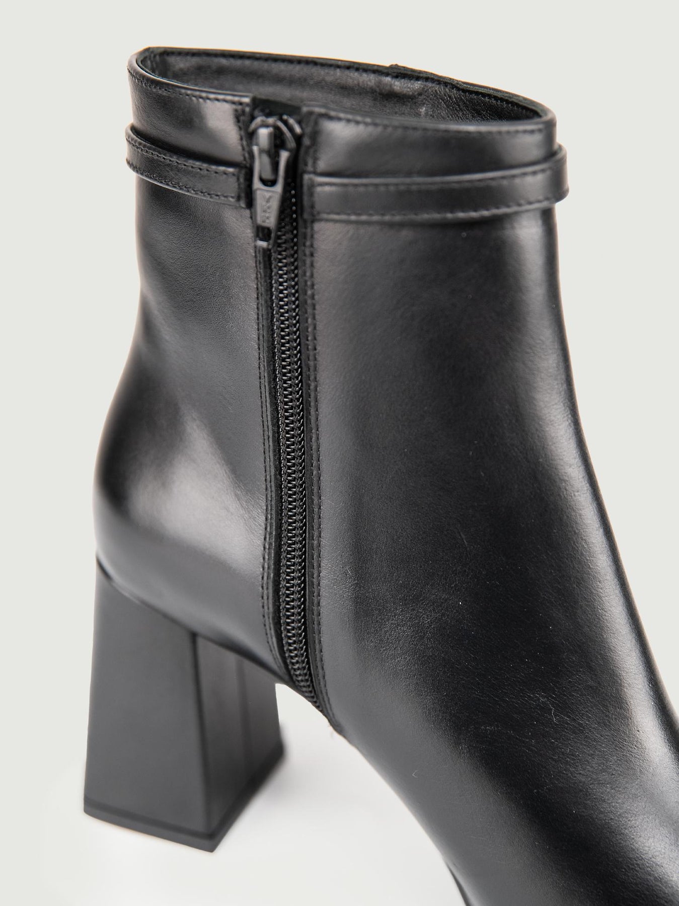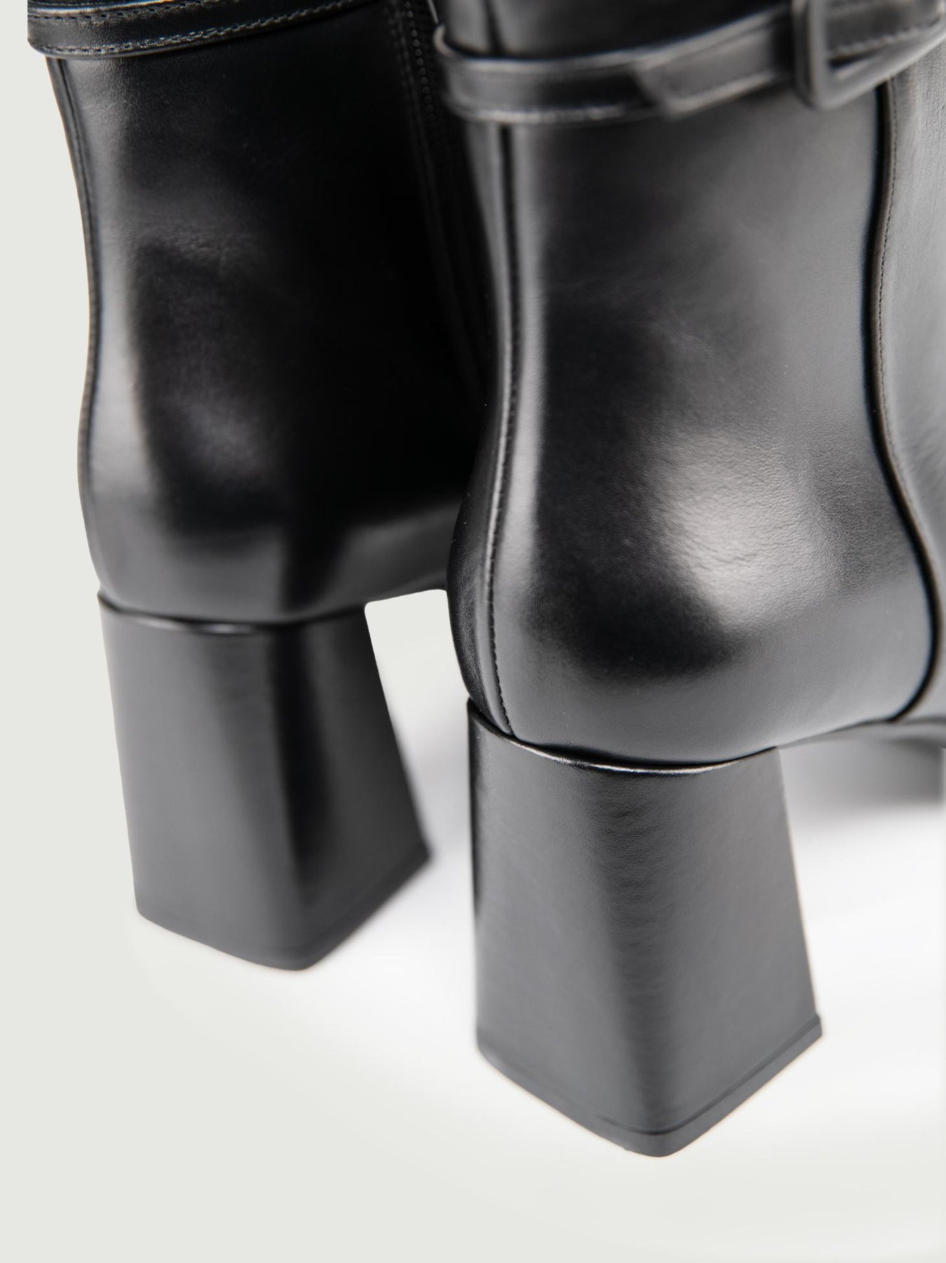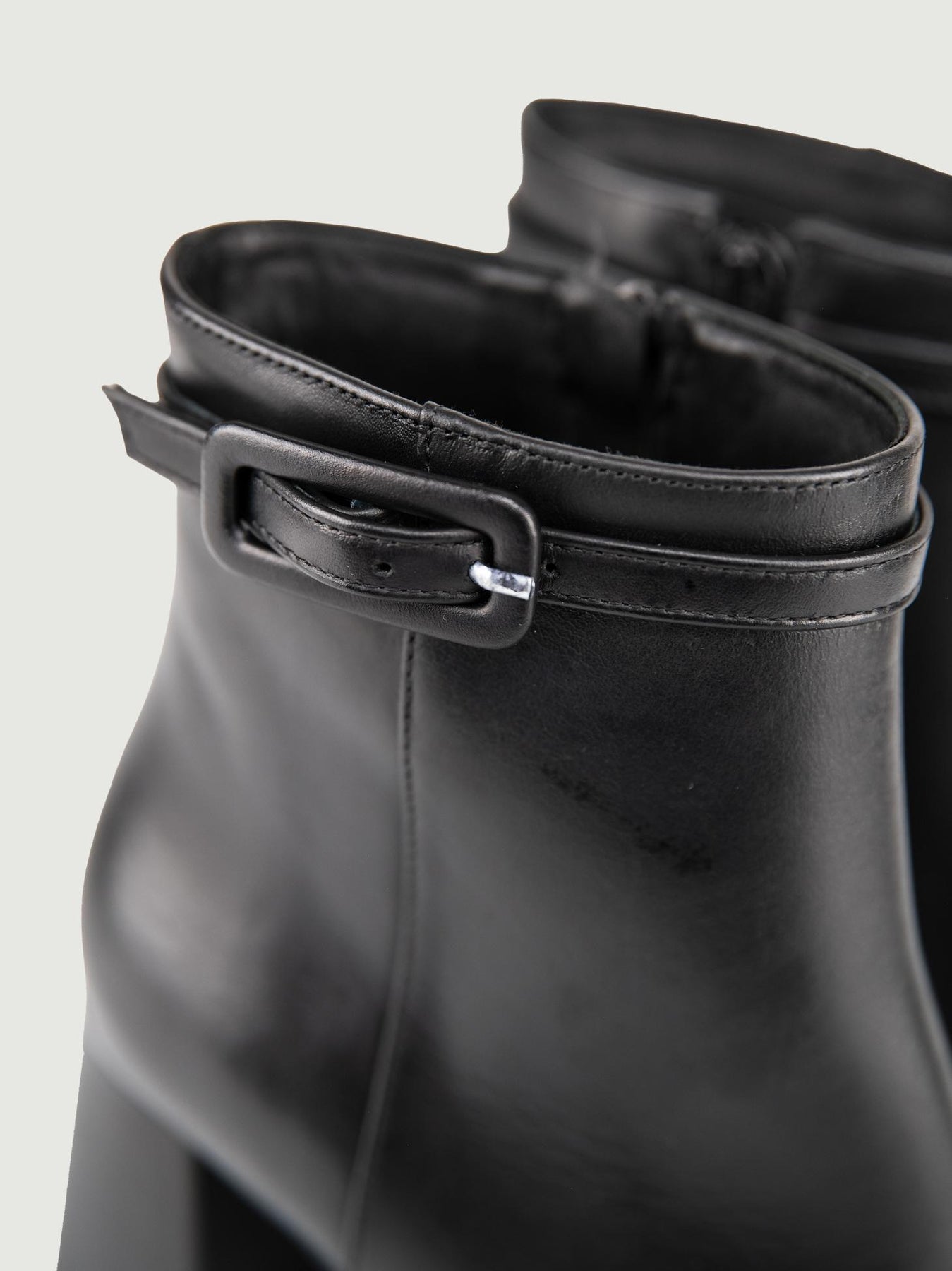 Tronchetto in pelle nero con tacco squadrato. Punta squadrata. Inserto cinturino alla caviglia con fibbia in tonalità. Altezza tacco: 8 cm. Tomaia: pelle. Fodera interna: pelle. Suola: gomma. Made in Italy. Designer: Andrea Morando